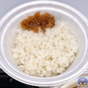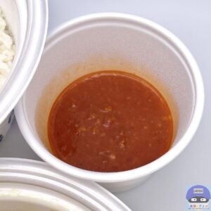 「ボルケーノうまトマハンバーグカレー弁当」の盛りつけ一例通りに、お皿に盛りつけます。