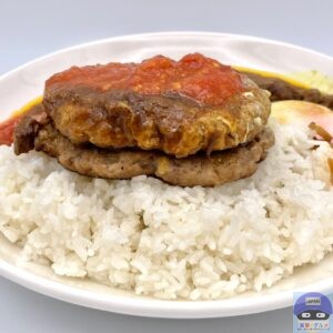 2枚重ねたハンバーグからうまトマソースが流れ、”食の火山”のようなインパクト抜群の見た目です。