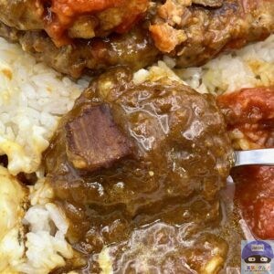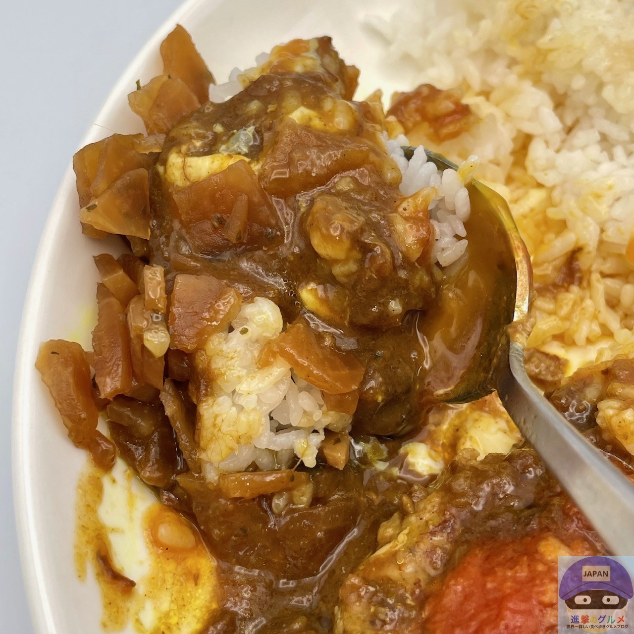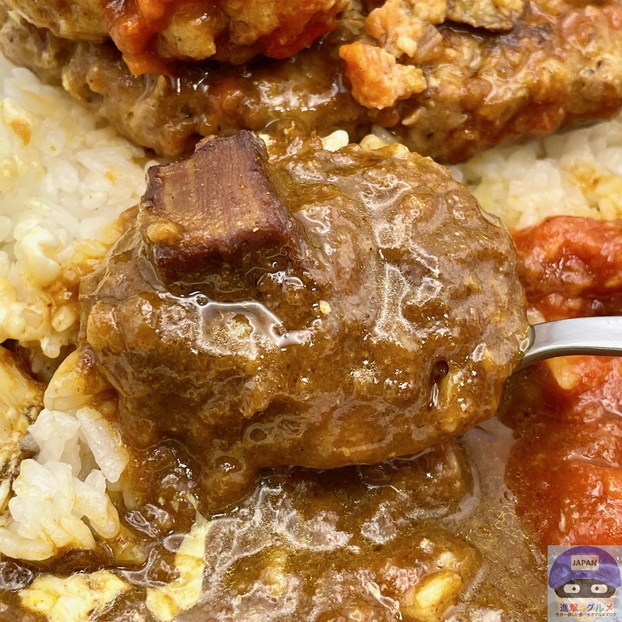 アブラ多めのカレーソースにほぐれる牛肉入りで旨みたっぷり、後からしっかりしたスパイシーさがヒリヒリ広がる辛口です。