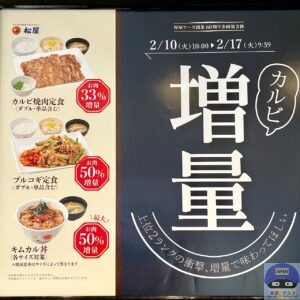 2026年2月10日(火)10時から2月17日(火)9時59分までの1週間限定、「松屋」が「カルビ焼肉増量フェア」を開催しています。