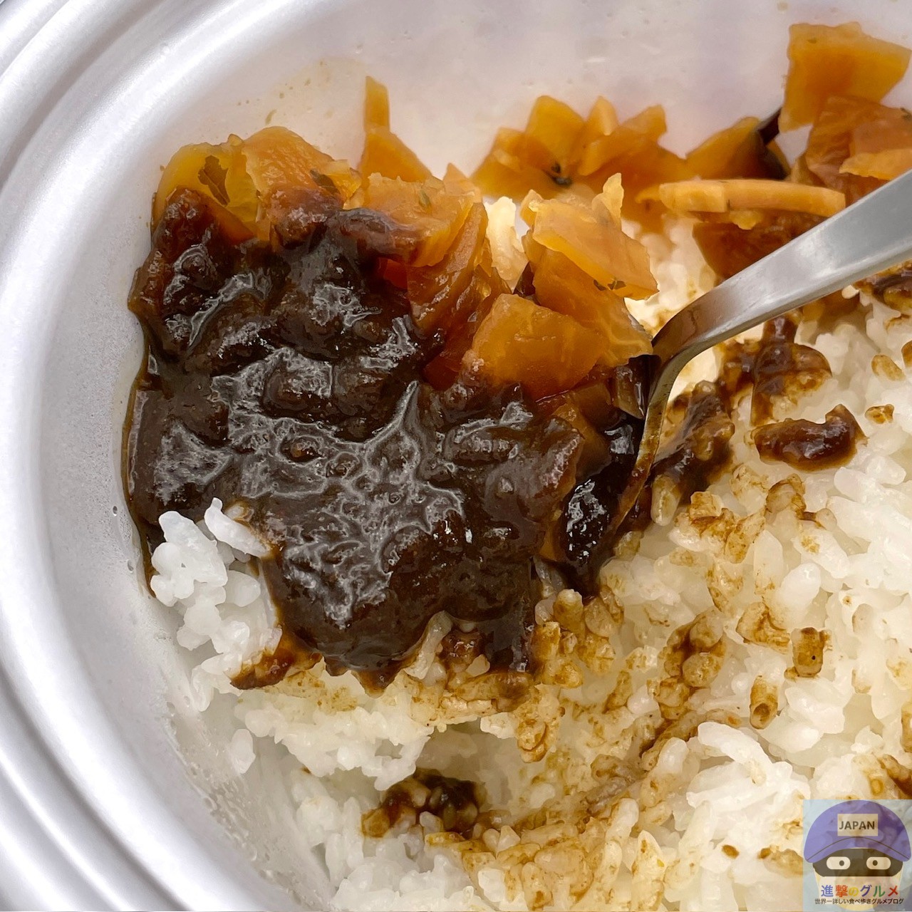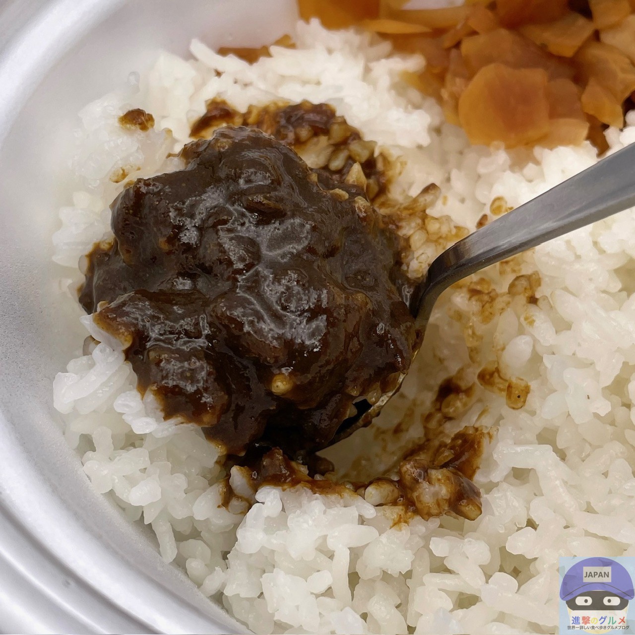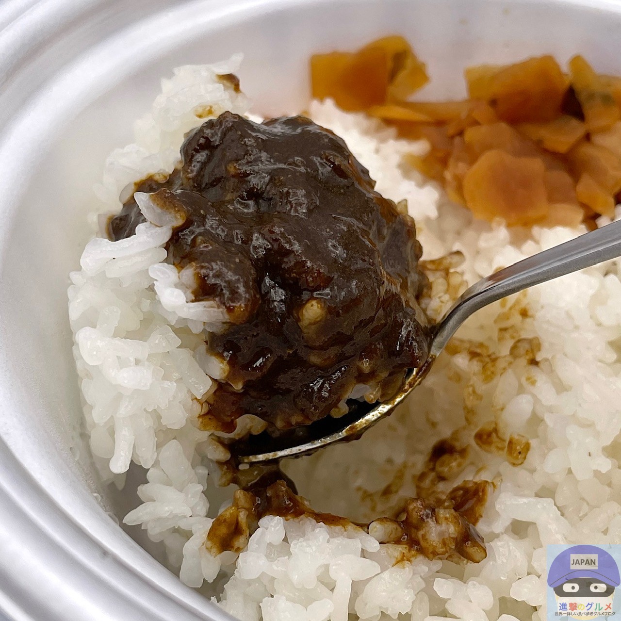 本格スパイスで具材が溶けた鬼辛カレーソース、福神漬け、特盛ライスです。