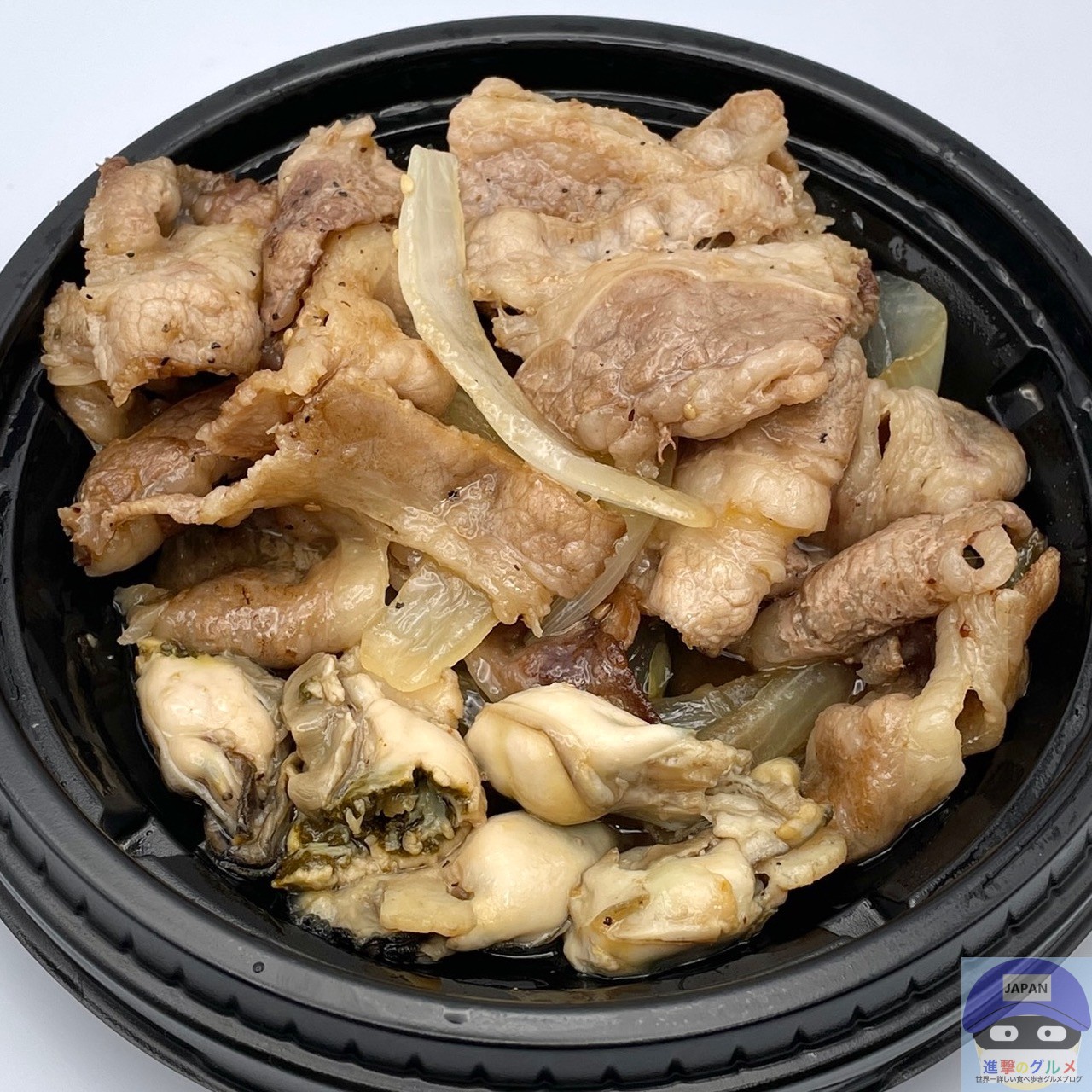 牛焼肉(12切れくらい)、牡蠣(5個)、玉ねぎ、特製オイスターダレなどで作られています。