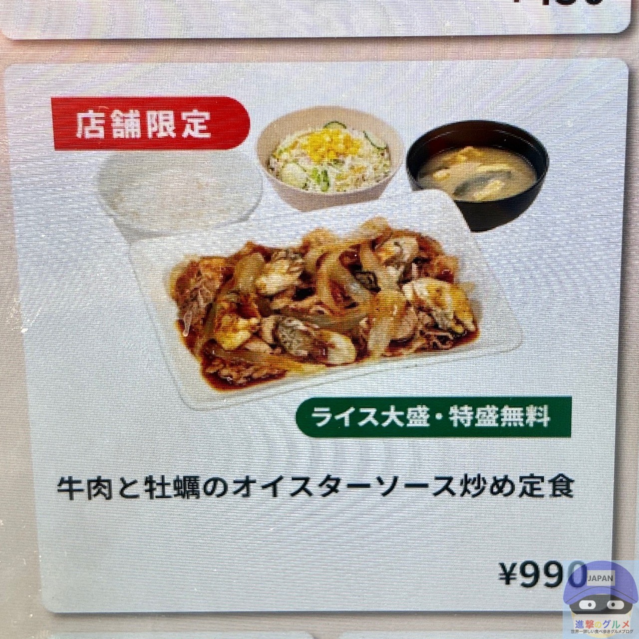 メニューは、ライス・生野菜付き「牛肉と牡蠣のオイスターソース炒め定食(990円)」、ライス付き「牛肉と牡蠣のオイスターソース炒め(890円)」があります。