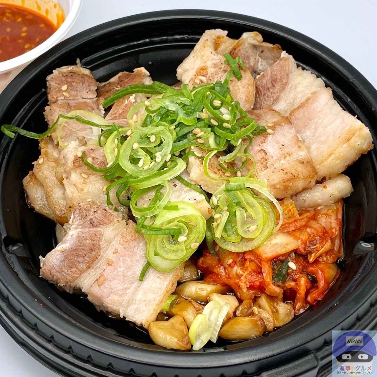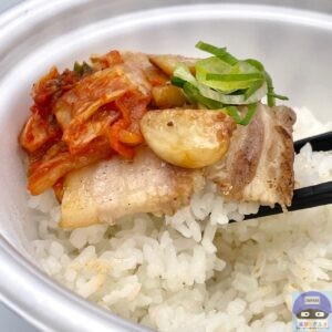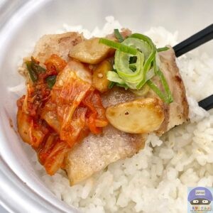 たっぷりの厚切り塩豚カルビ焼肉、にんにく、キムチ、青ねぎが入っています。