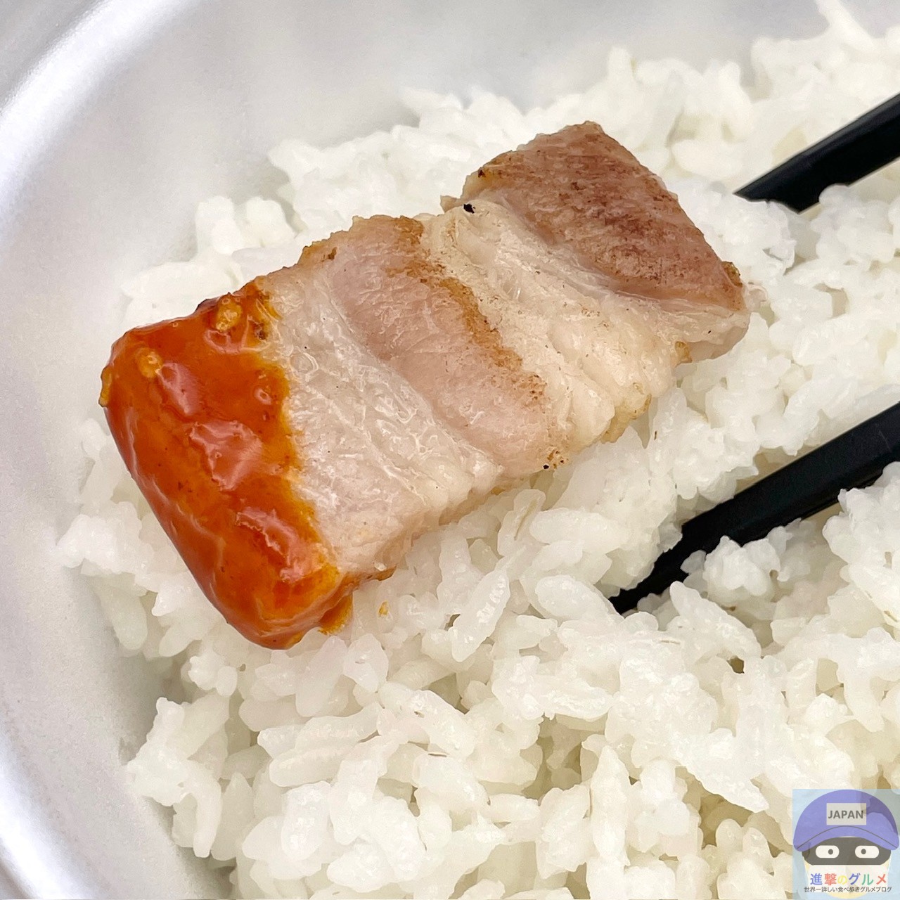 肉肉しくて程よくジューシー、豚肉の香ばしい旨みと脂身の甘みを感じ、塩気が効いてそのままで美味しいです。