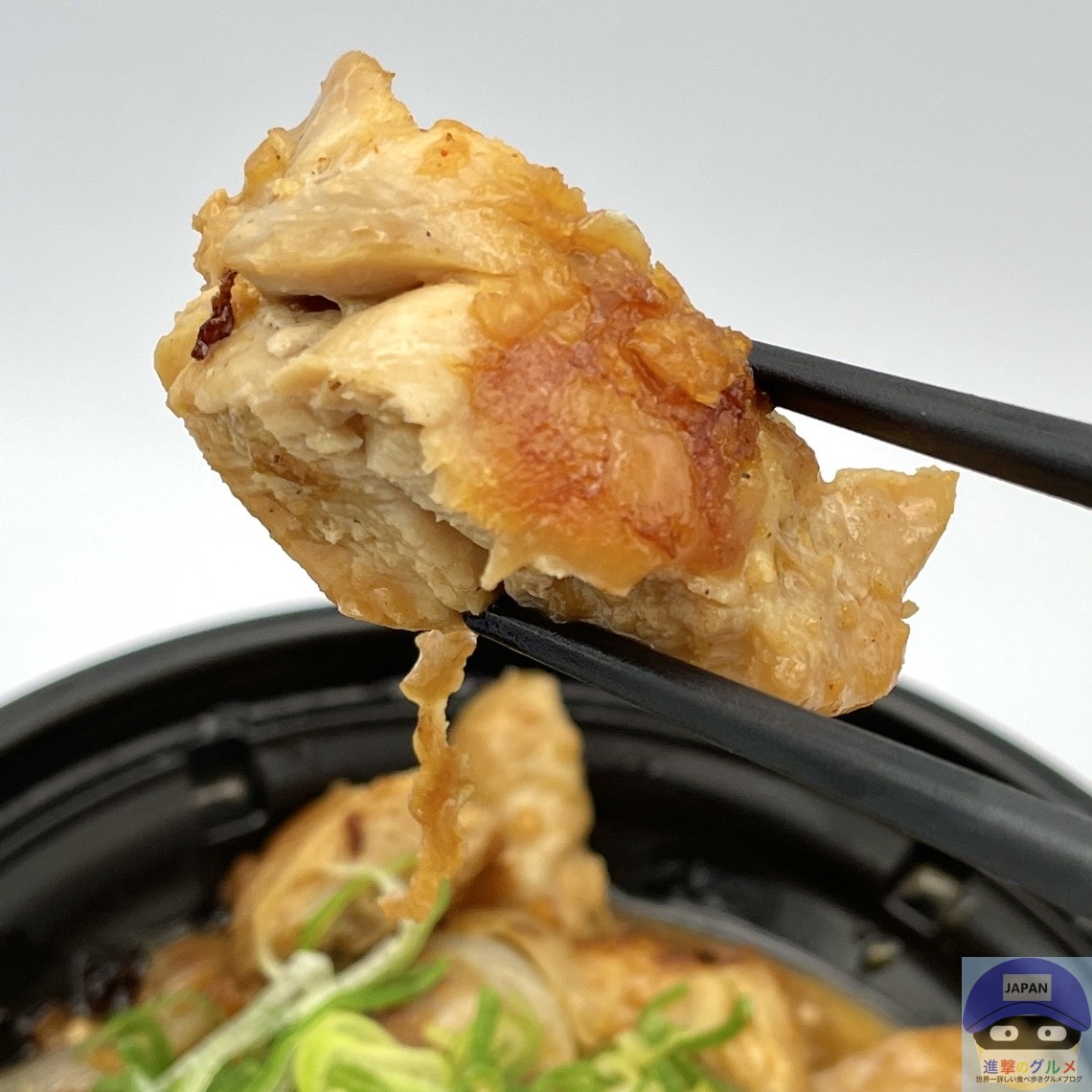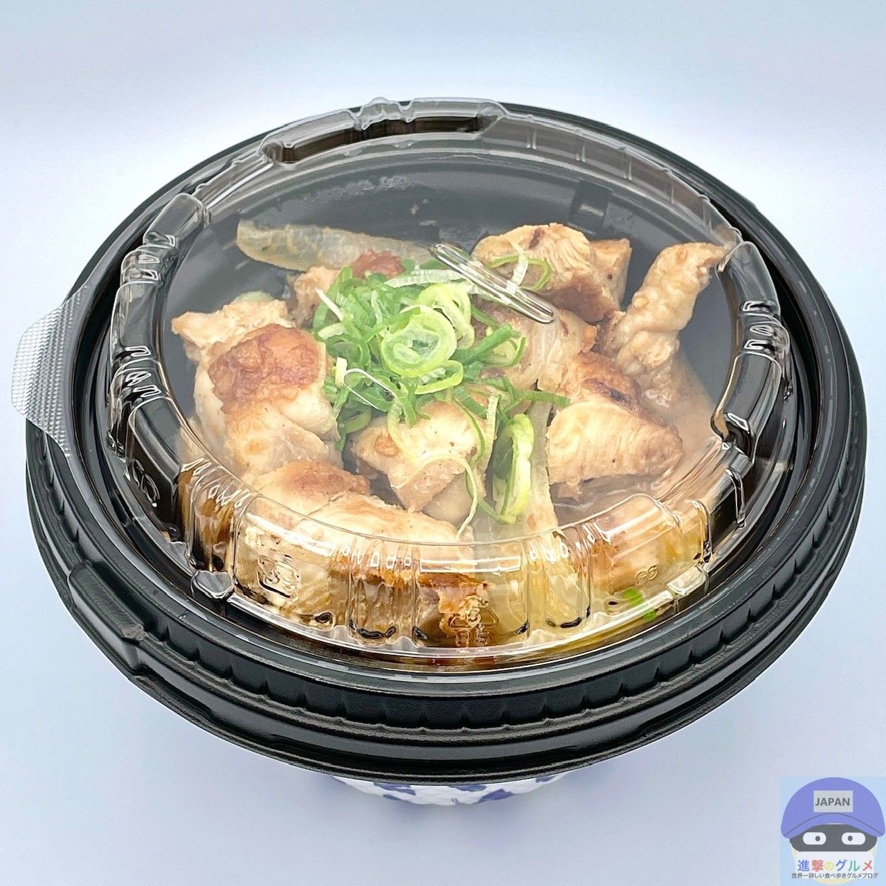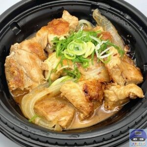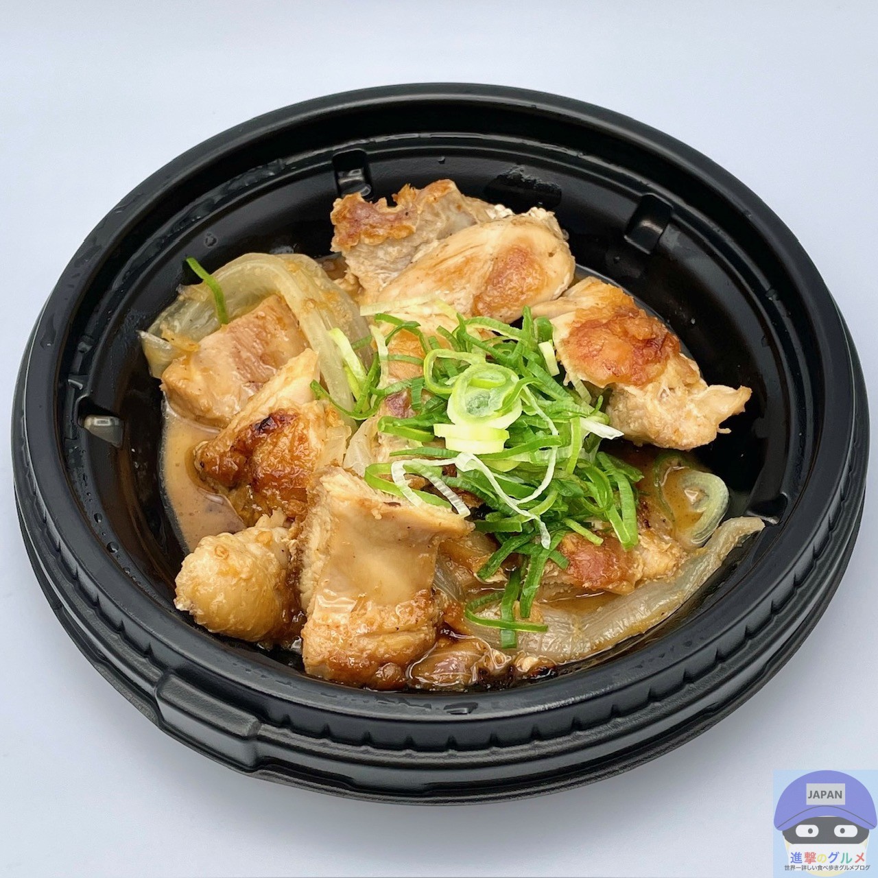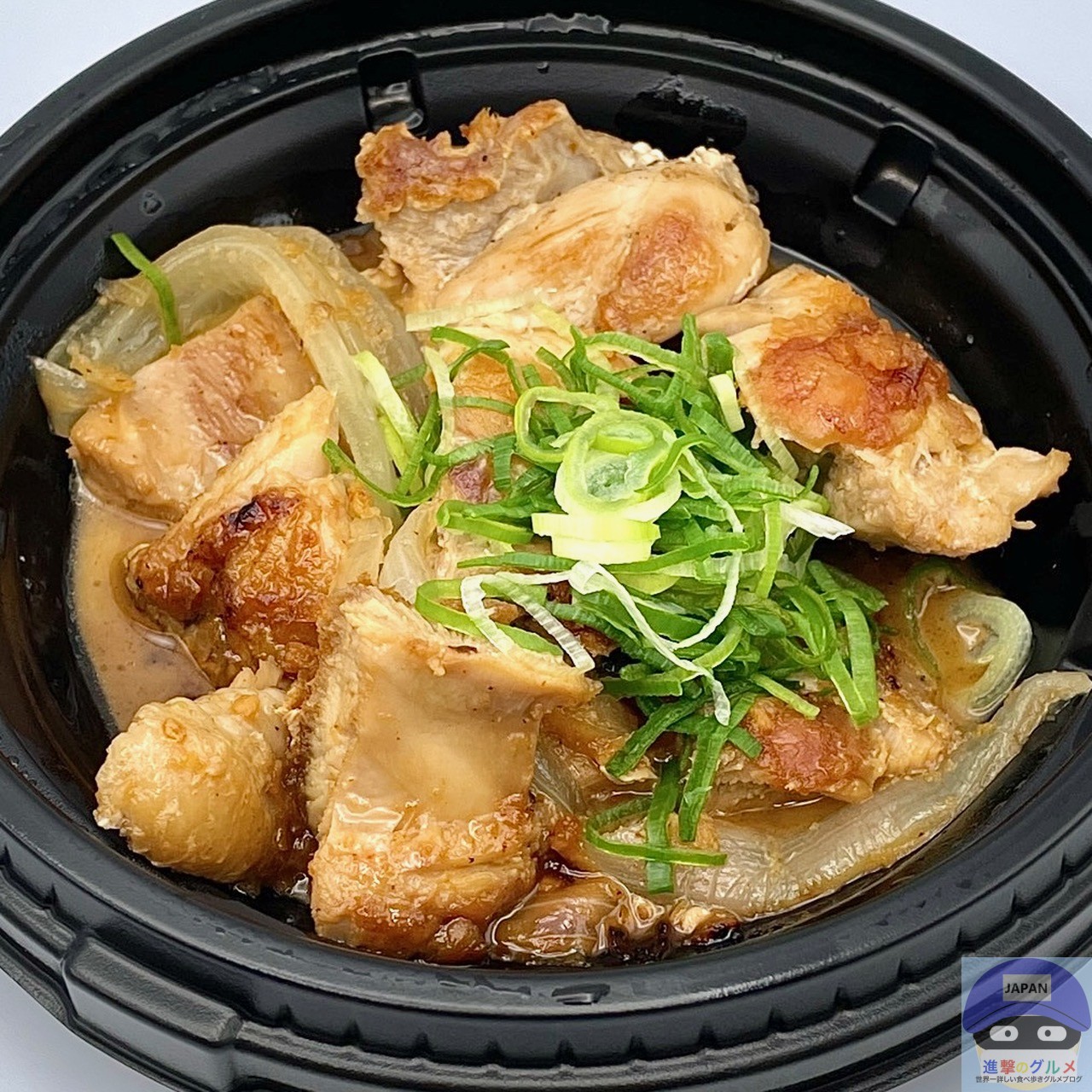 ごろごろチキンと玉ねぎを、バターとにんにく醤油の特製ダレで炒めて、青ねぎを添えています。
