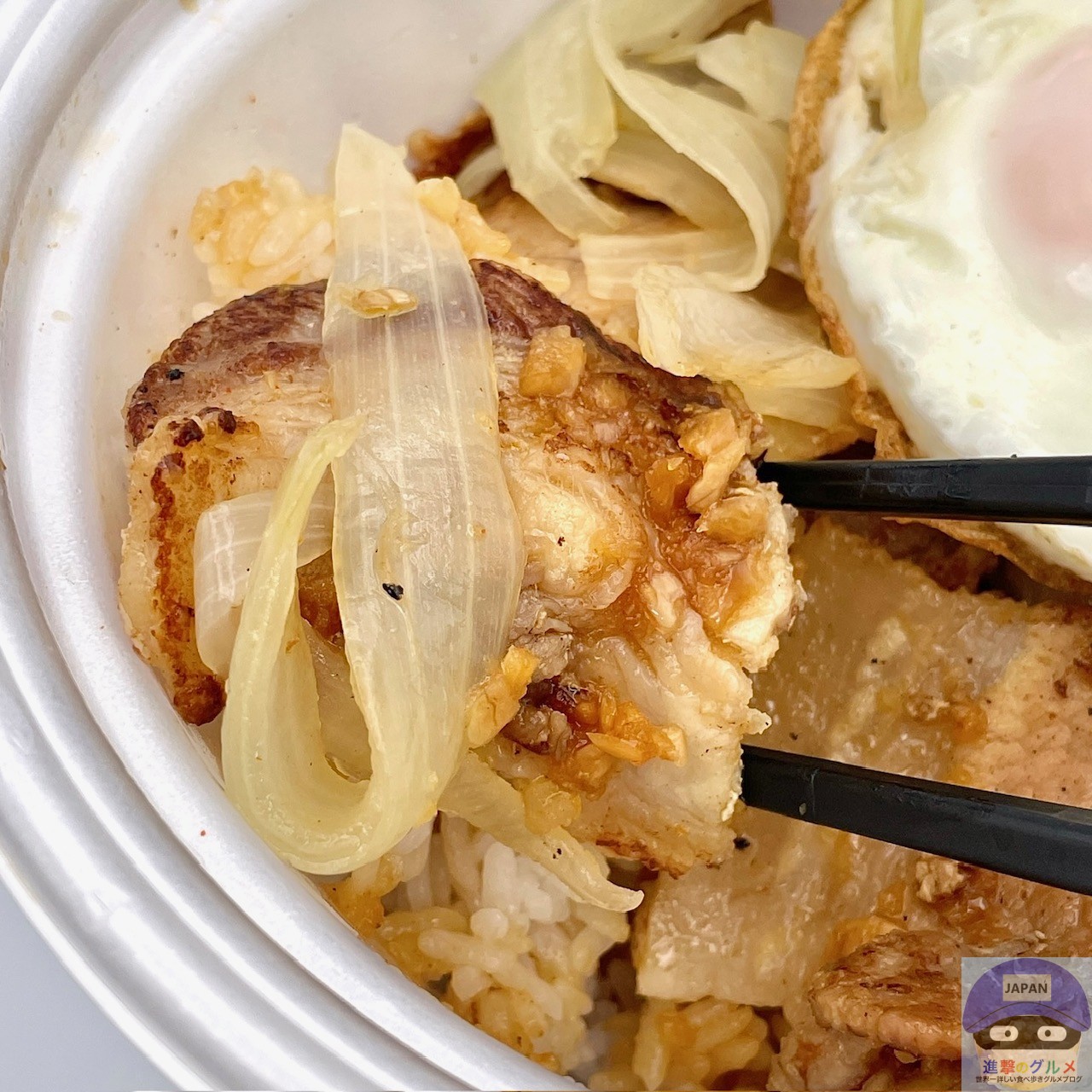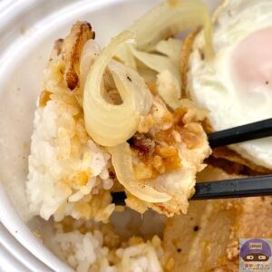豚カルビ肉をバターとにんにく醤油の特製ダレで炒め、玉ねぎと目玉焼きを一緒にライスに盛りつけた、魅力的な見た目です。