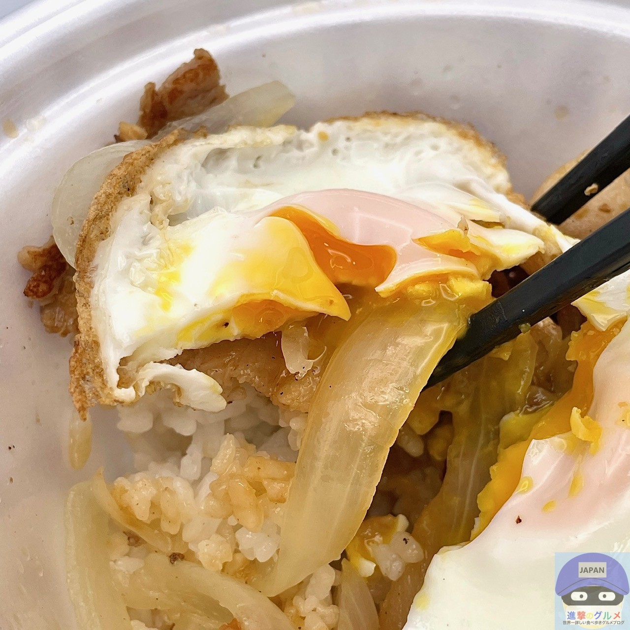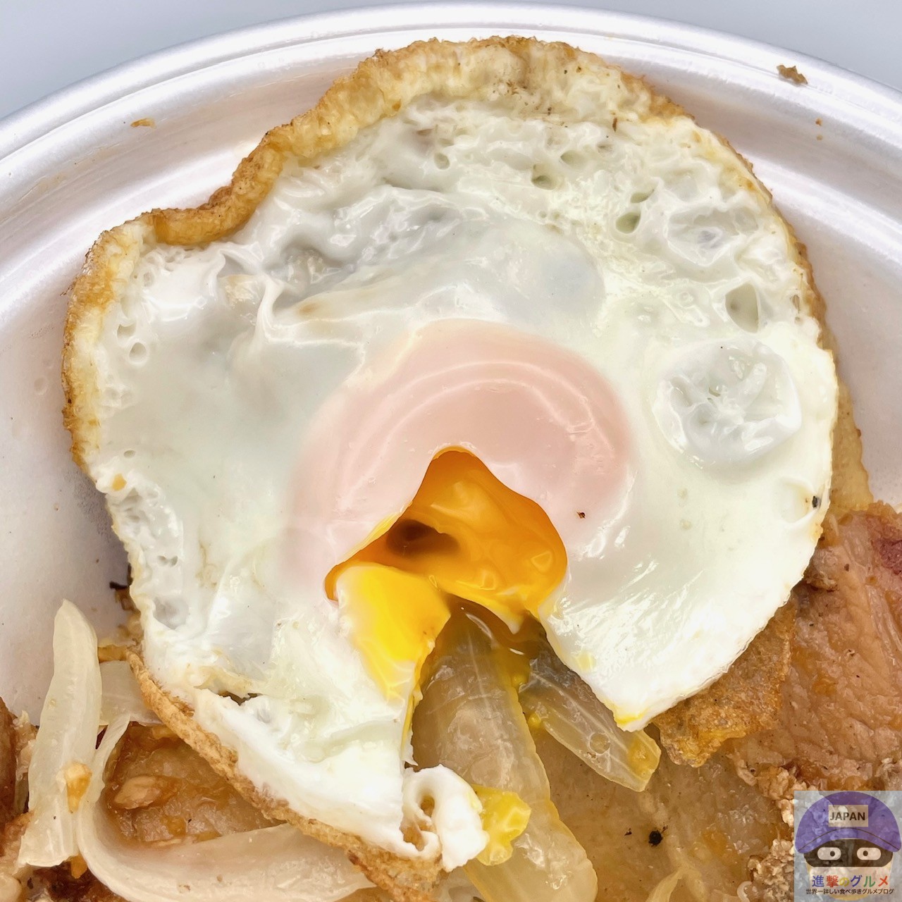 豚カルビ肉・玉ねぎ・目玉焼きの焼き具合は、このような感じです。