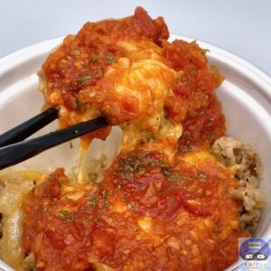 牛めしにとろーり濃厚なチーズをたっぷりのせて、その上から大胆にうまトマソースをかけた、食欲そそる一杯です。