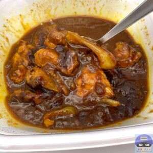 特製オリジナルカレーソースに、ごろごろチキンと玉ねぎが入っています。
