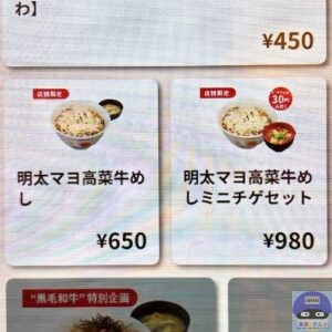 「明太マヨ高菜牛めし(650円)」は、牛めしにピリ辛高菜をのせ、明太マヨをたっぷりかけた一杯です。