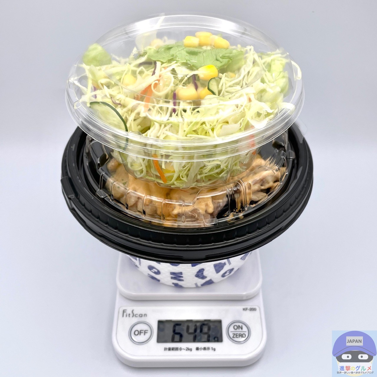 重さをはかると、容器を含めて649gでした。