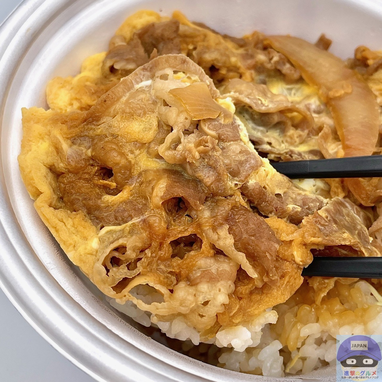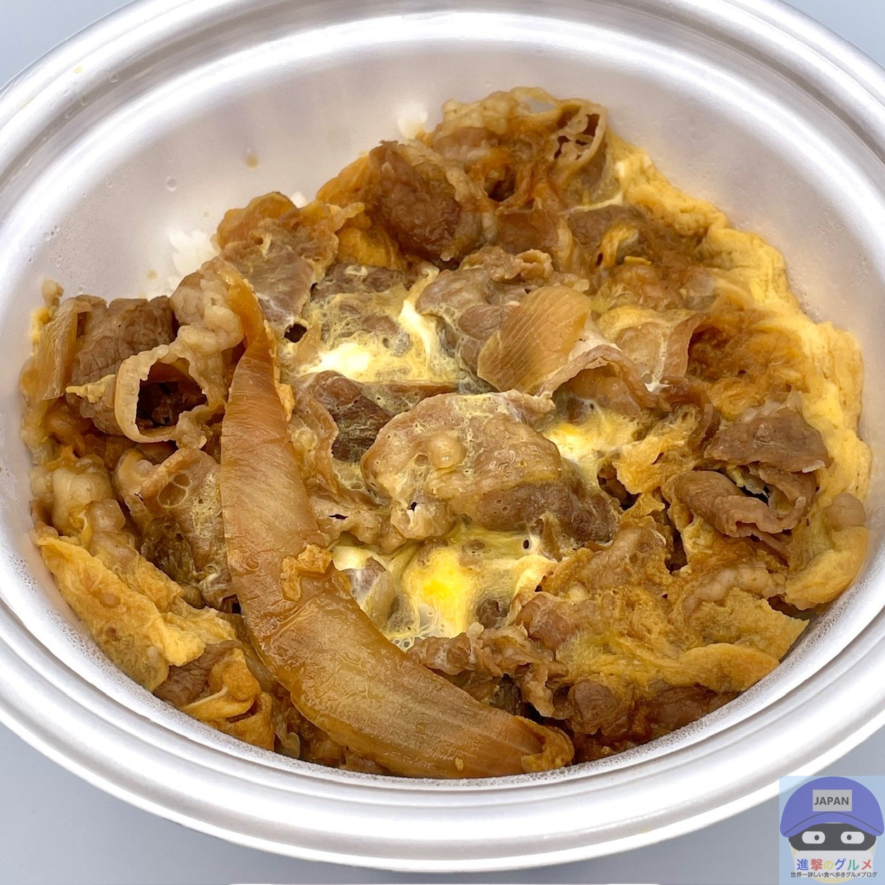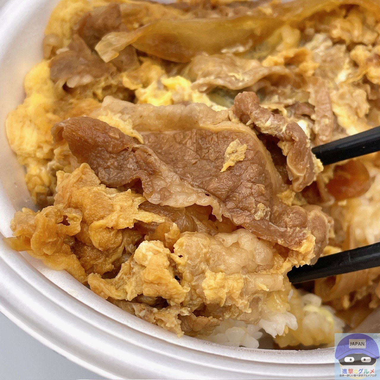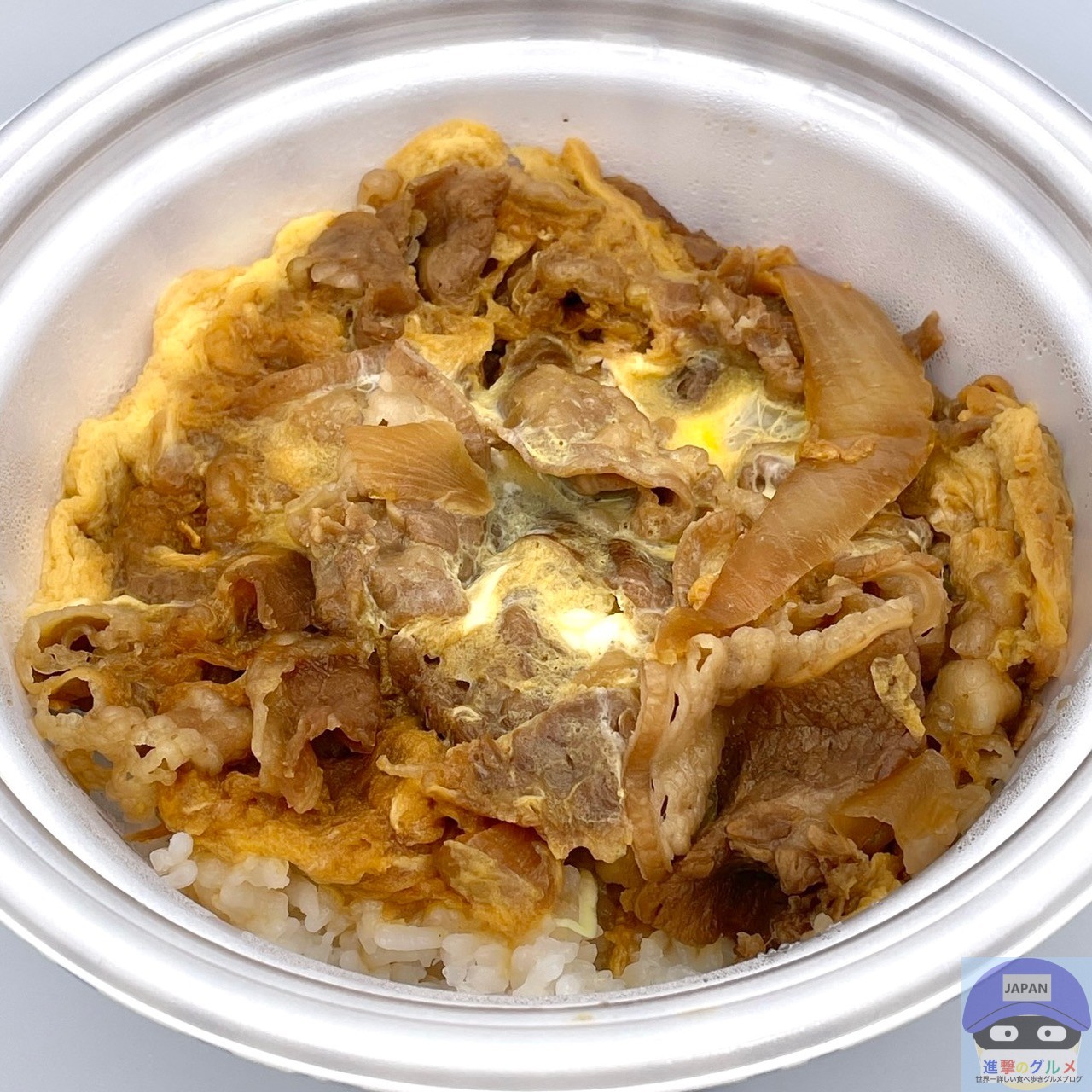 秘伝のタレで煮た牛肉と玉ねぎの卵とじを大盛りライスに盛りつけたシンプルな見た目、あまじょっぱい濃い香りがします。