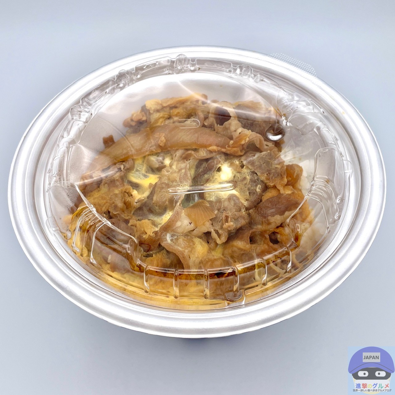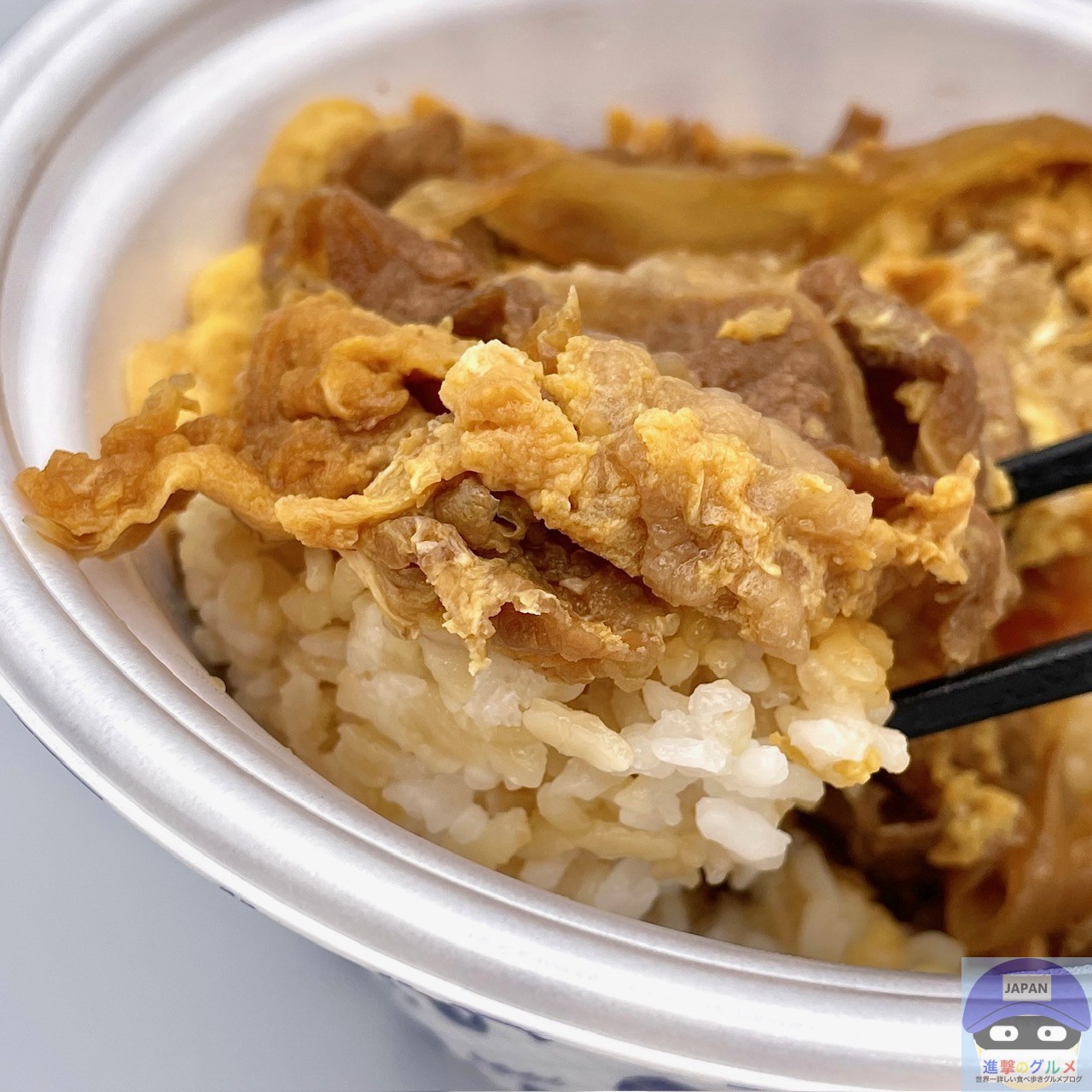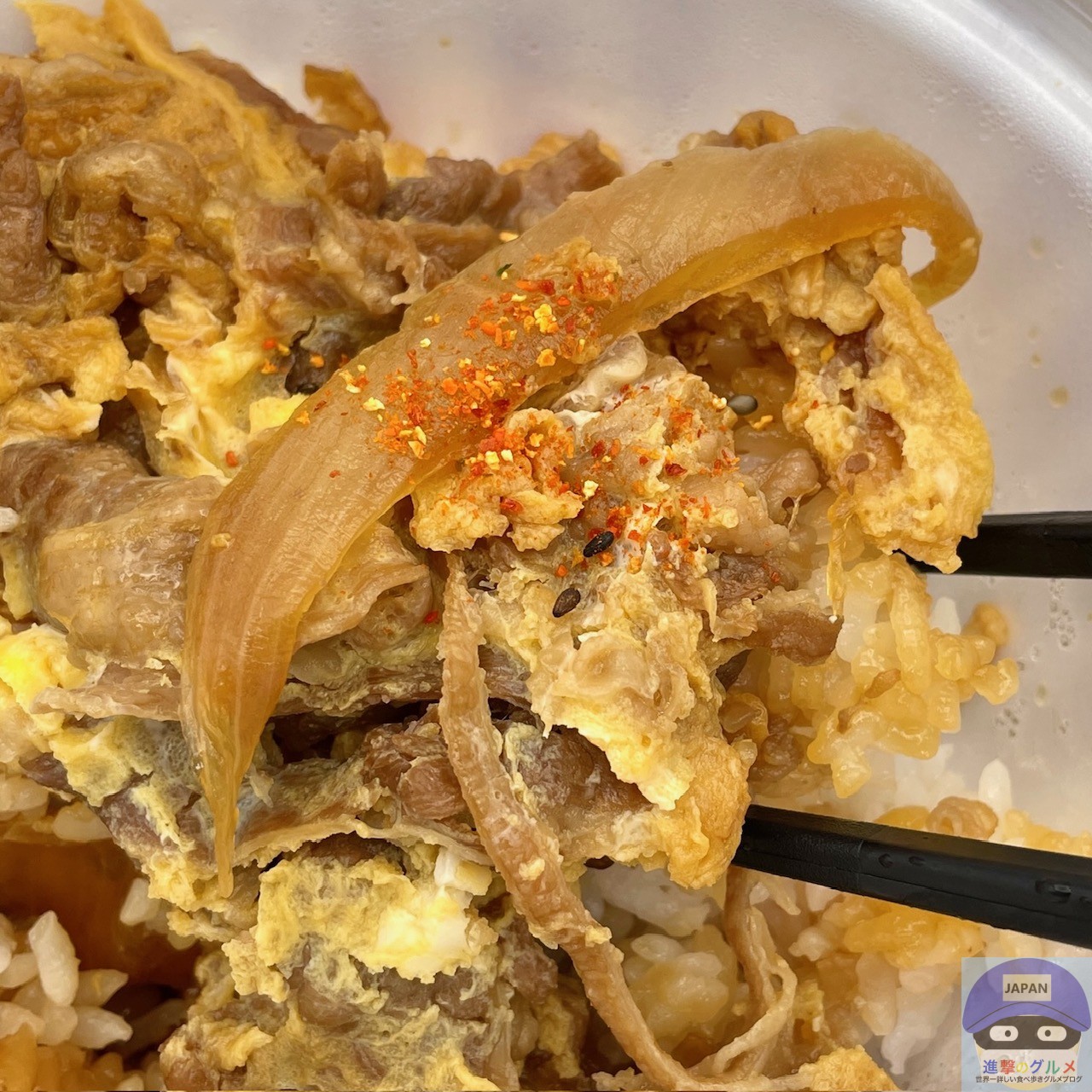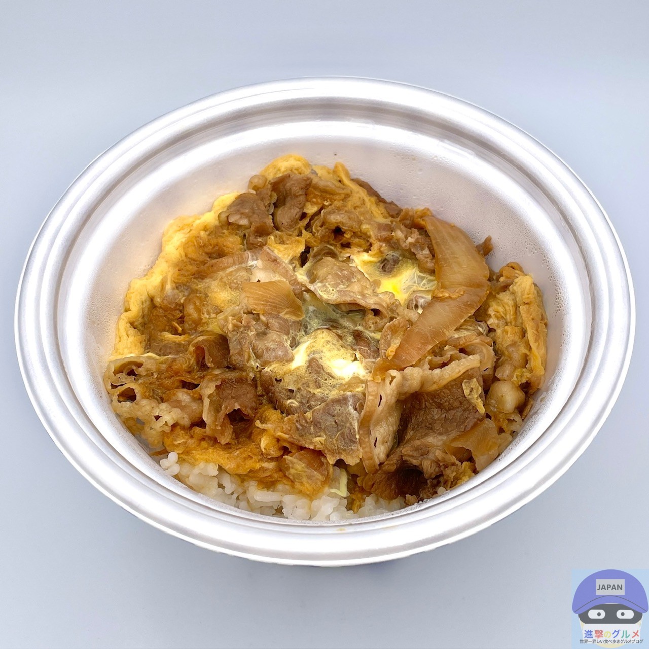 秘伝のタレで煮た牛肉と玉ねぎの卵とじを大盛りライスに盛りつけたシンプルな見た目、あまじょっぱい濃い香りがします。