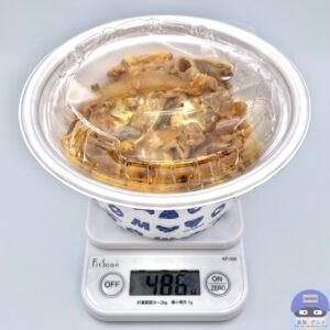 重さをはかると、容器を含めて486gでした。