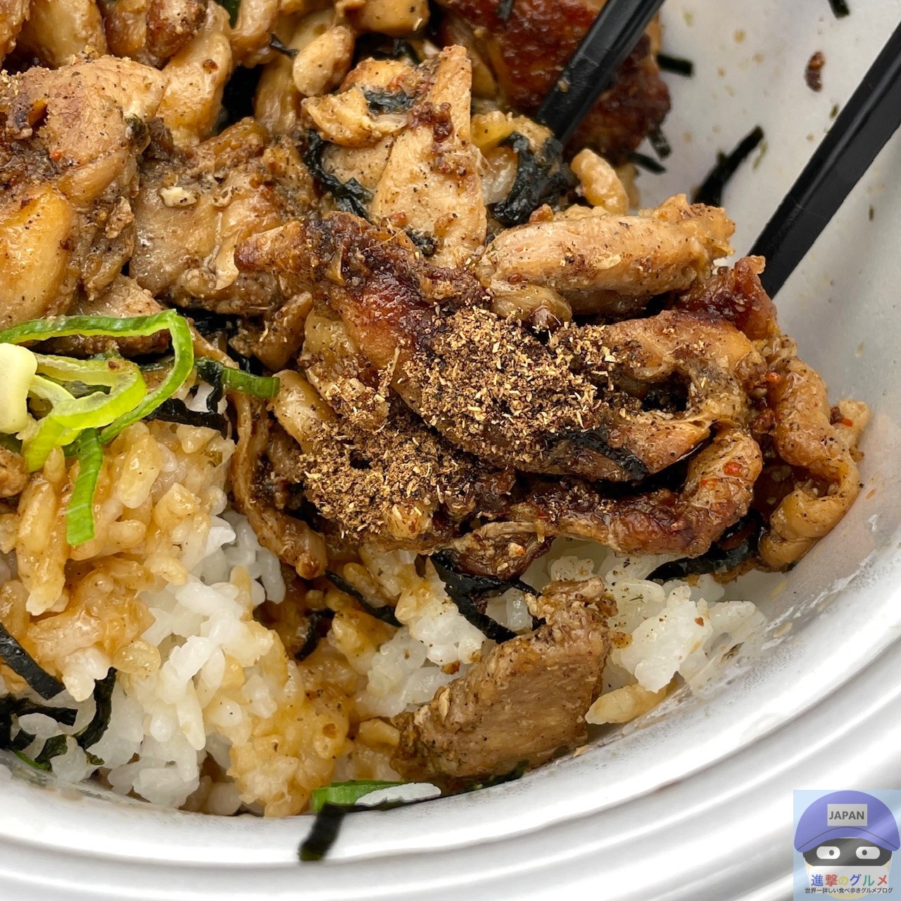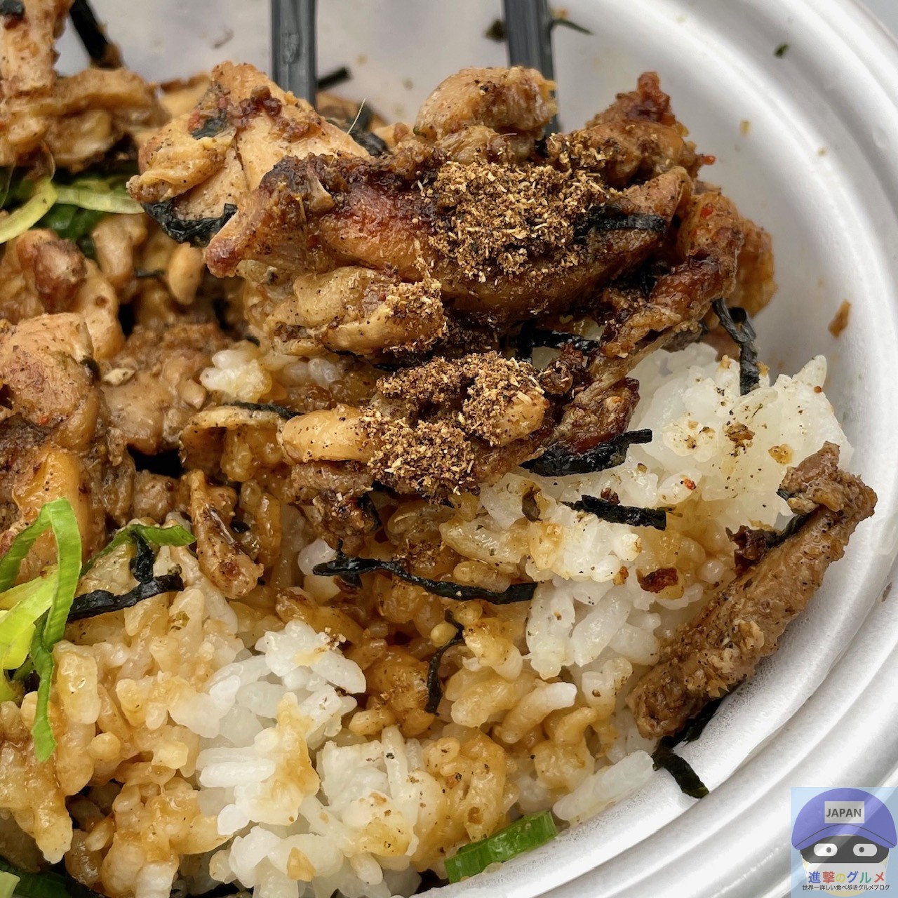 かしわ(鶏肉)、花椒、山椒、バター醤油、ねぎ、きざみ海苔、ライスなどで作られています。