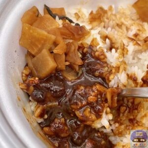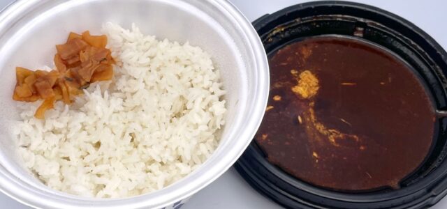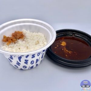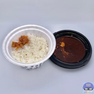 食材の旨味やスパイスが溶け込んだ黒いカレーソース、福神漬け、特盛ライスの組み合わせです。