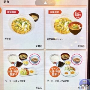5時から11時までの朝食メニュー、60円お得な「衣笠丼・豚汁セット(560円)」もあります。