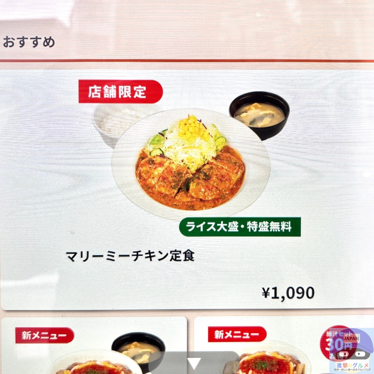今回は、「マリーミーチキン定食・ライス特盛(1090円)」を注文してテイクアウトします。