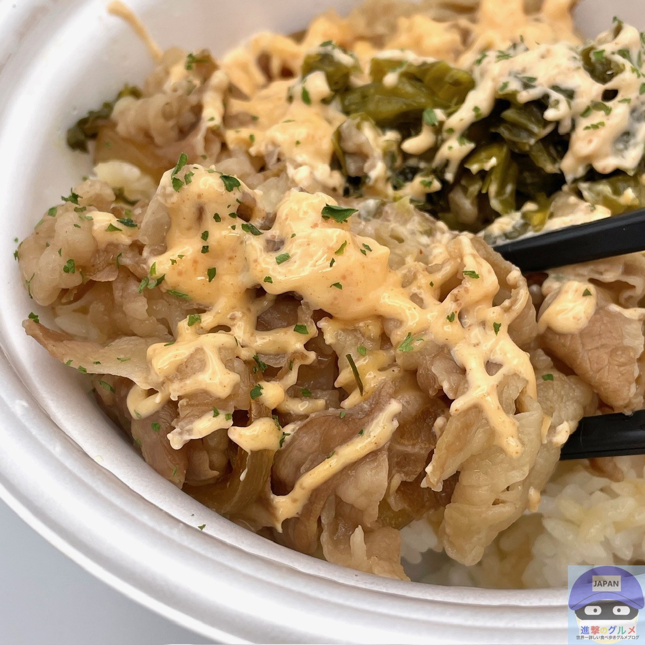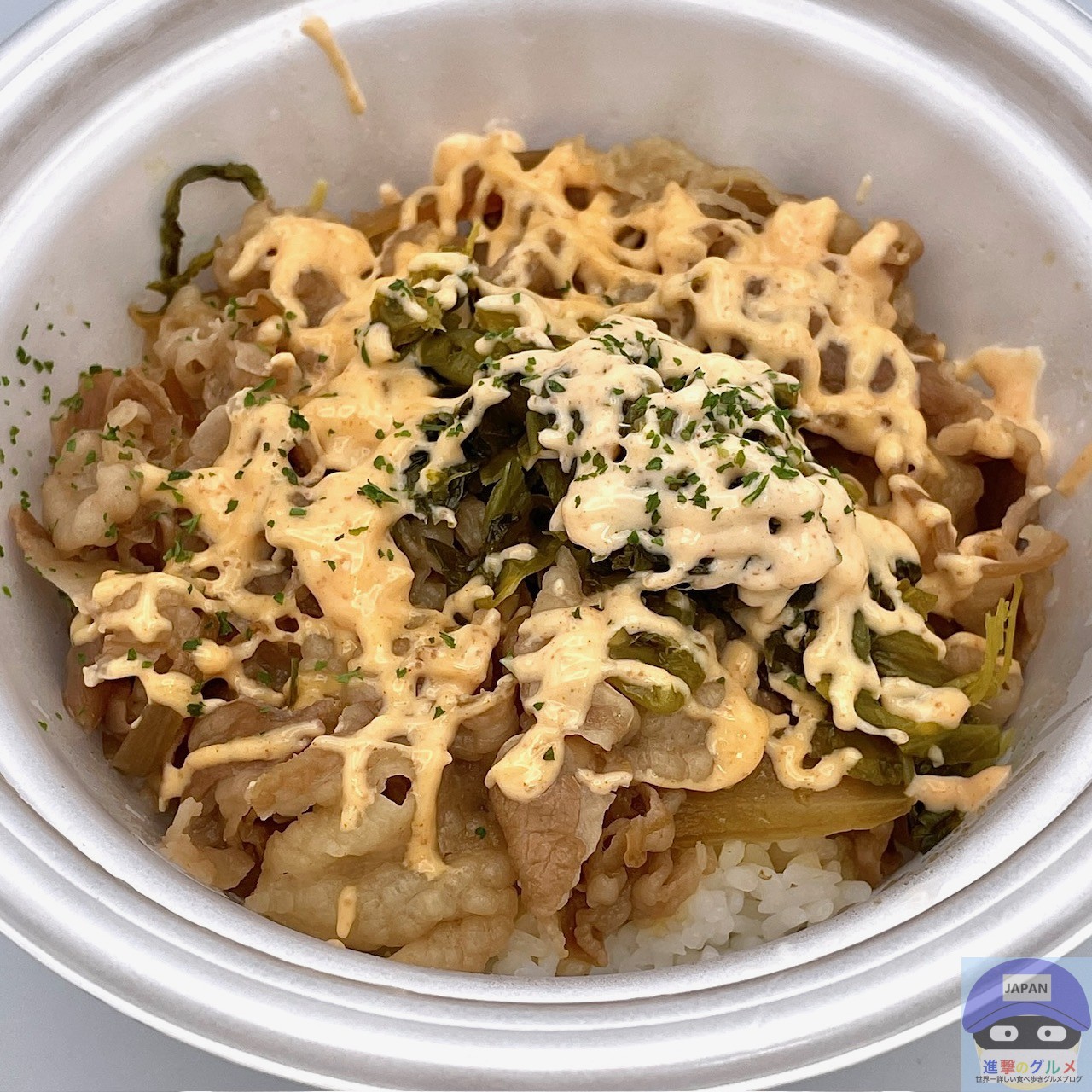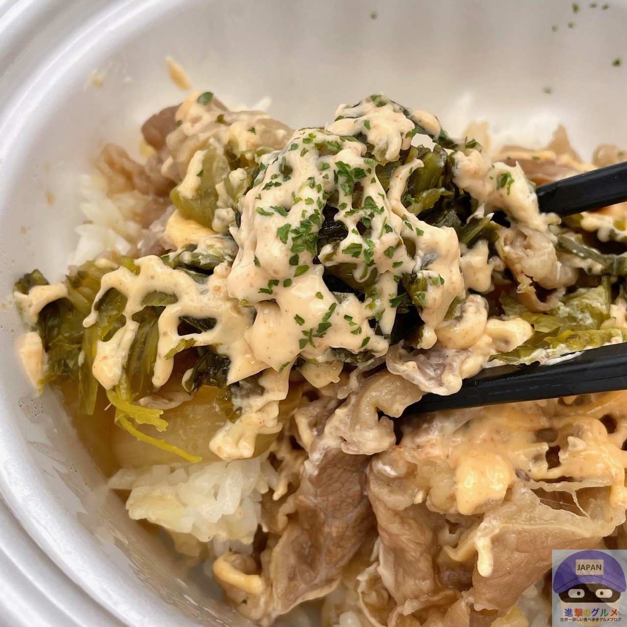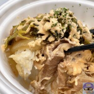牛めし・並盛にピリ辛高菜をのせ、明太マヨネーズがたっぷりかかっています。
