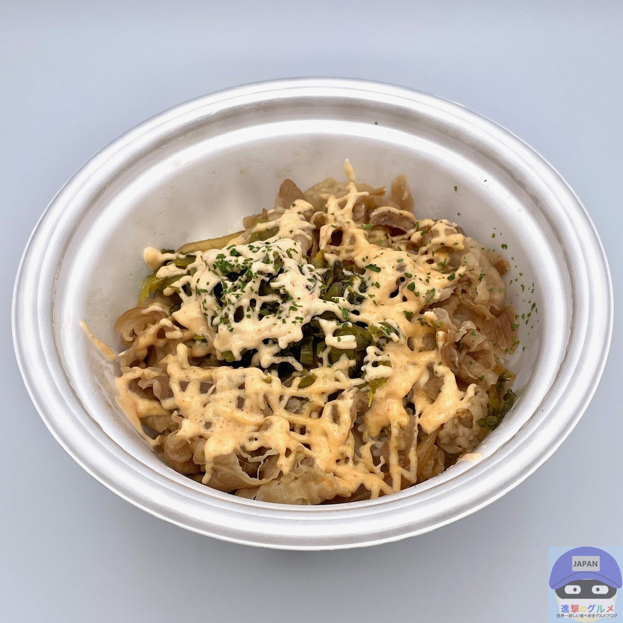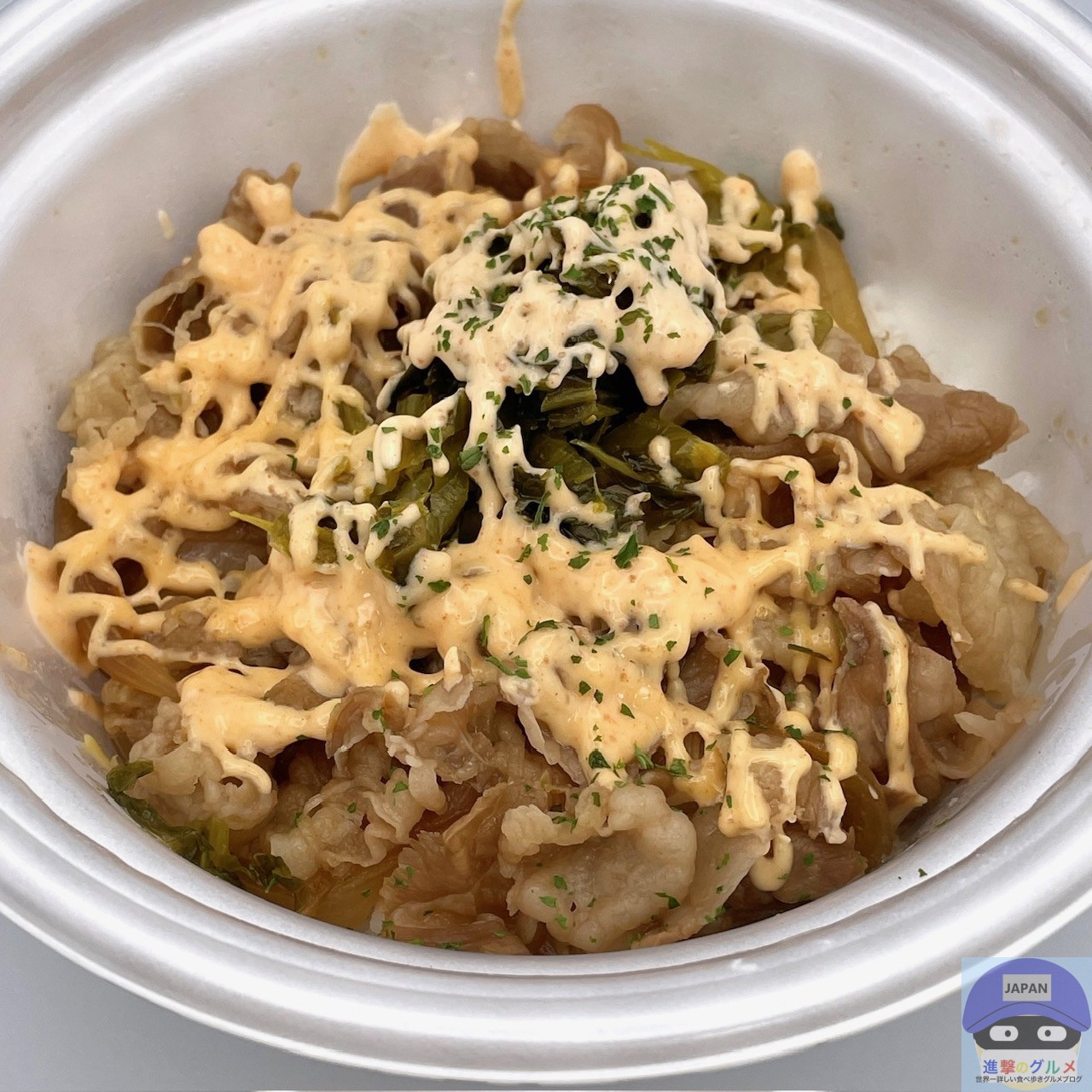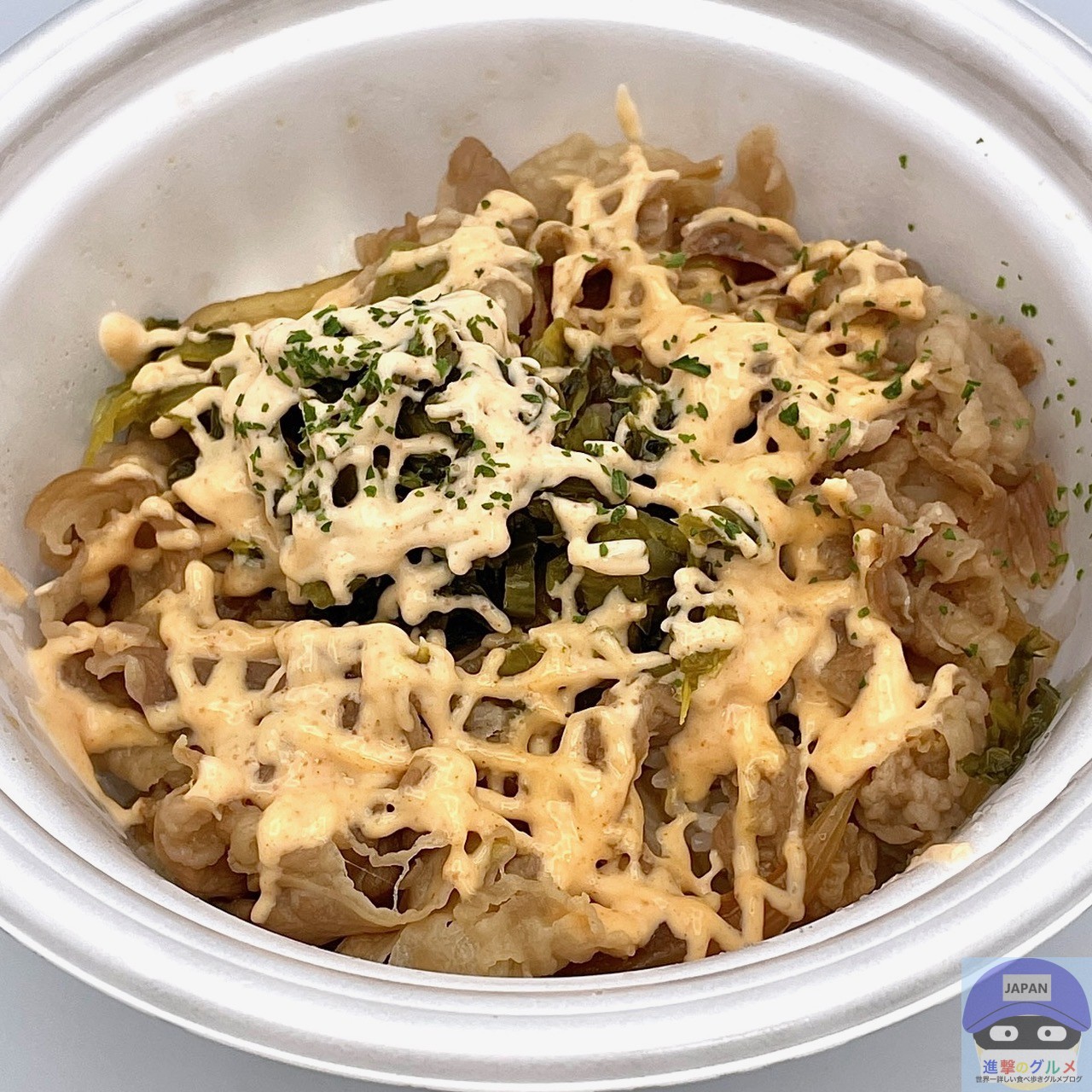 牛めし・並盛にピリ辛高菜をのせ、明太マヨネーズがたっぷりかかっています。