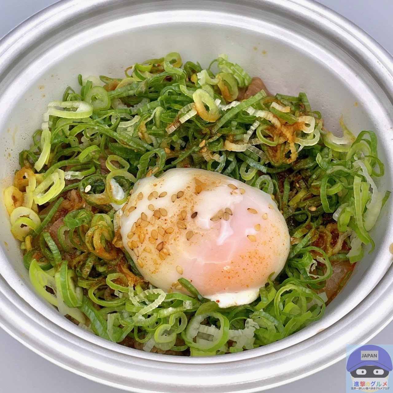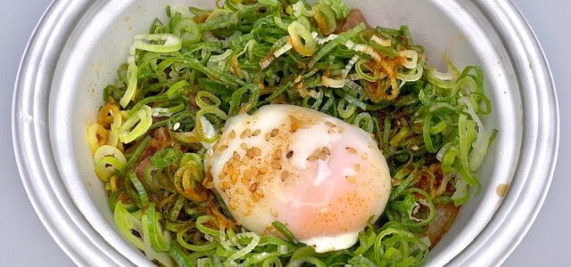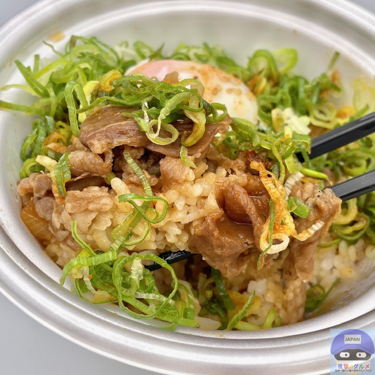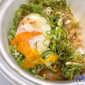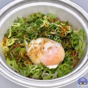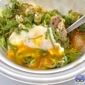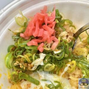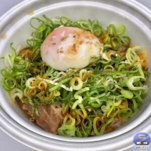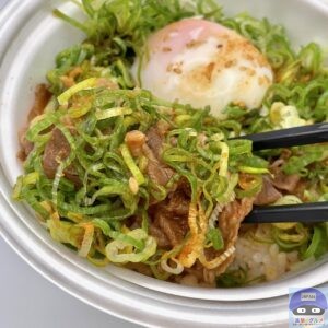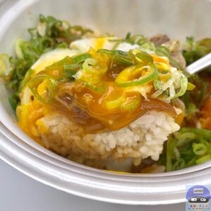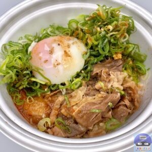 甘辛く味付けされた、少し噛みごたえのある牛肉の旨みと脂身の甘み、シャキシャキ玉ねぎの甘みを感じ、青ネギのシャキッと食感と風味がアクセントです。