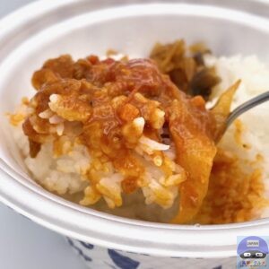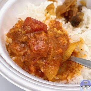 ライスがすすんで食べごたえ抜群、しんなりシャキッとした玉ねぎ、細かい具材もアクセント、後味にスパイシーさが残ります。