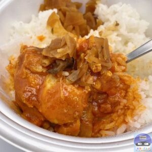 カレーソースは、トマトの酸味と程よいスパイス感に、ココナッツミルクの甘みが少しあり、ピリピリとした中辛くらいの辛さです。