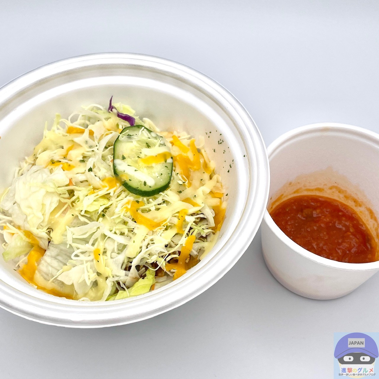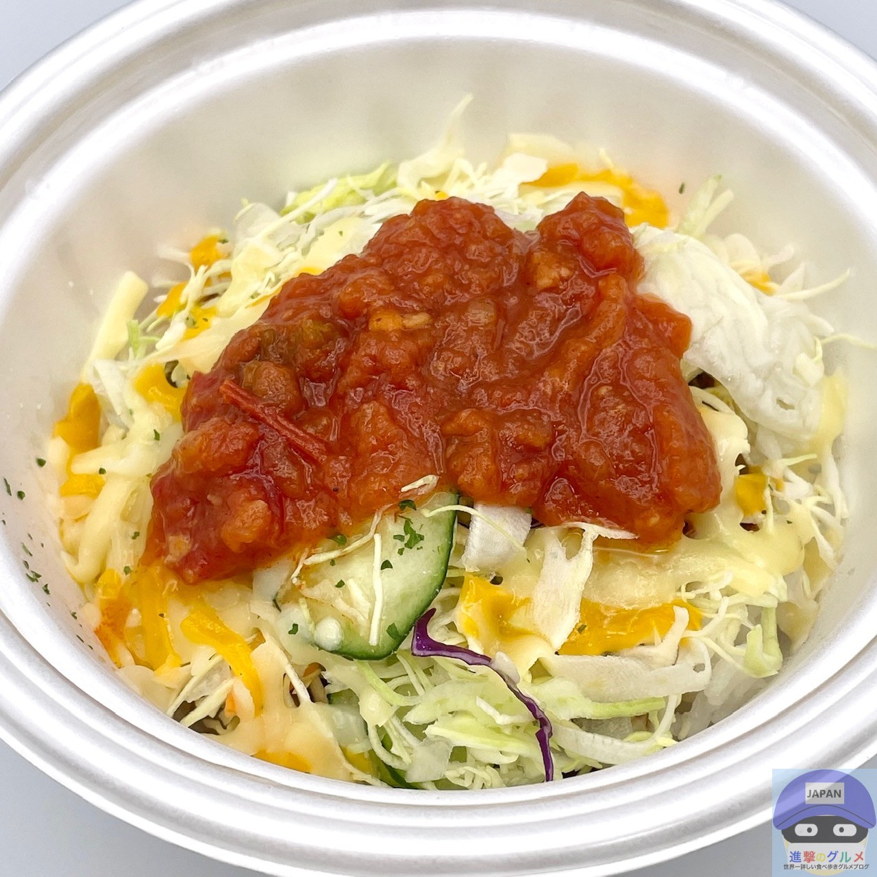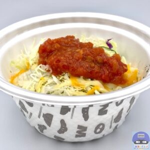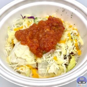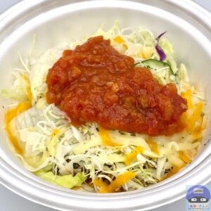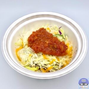 サルサソース、チーズ、生野菜、ミートソース、ライスで作られたシンプルな見た目です。