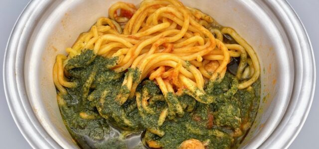 ナポリタン風に味付けしたパスタ(中太麺)、ごろごろチキン、うまトマソース、バジルソースの組み合わせです。