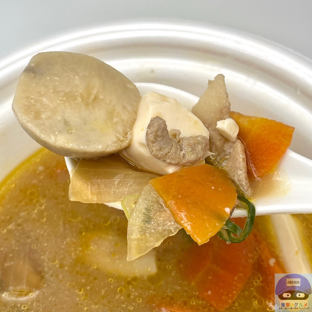 豚肉や里芋、豆腐の旨みを感じ、油で少しこってりしています。