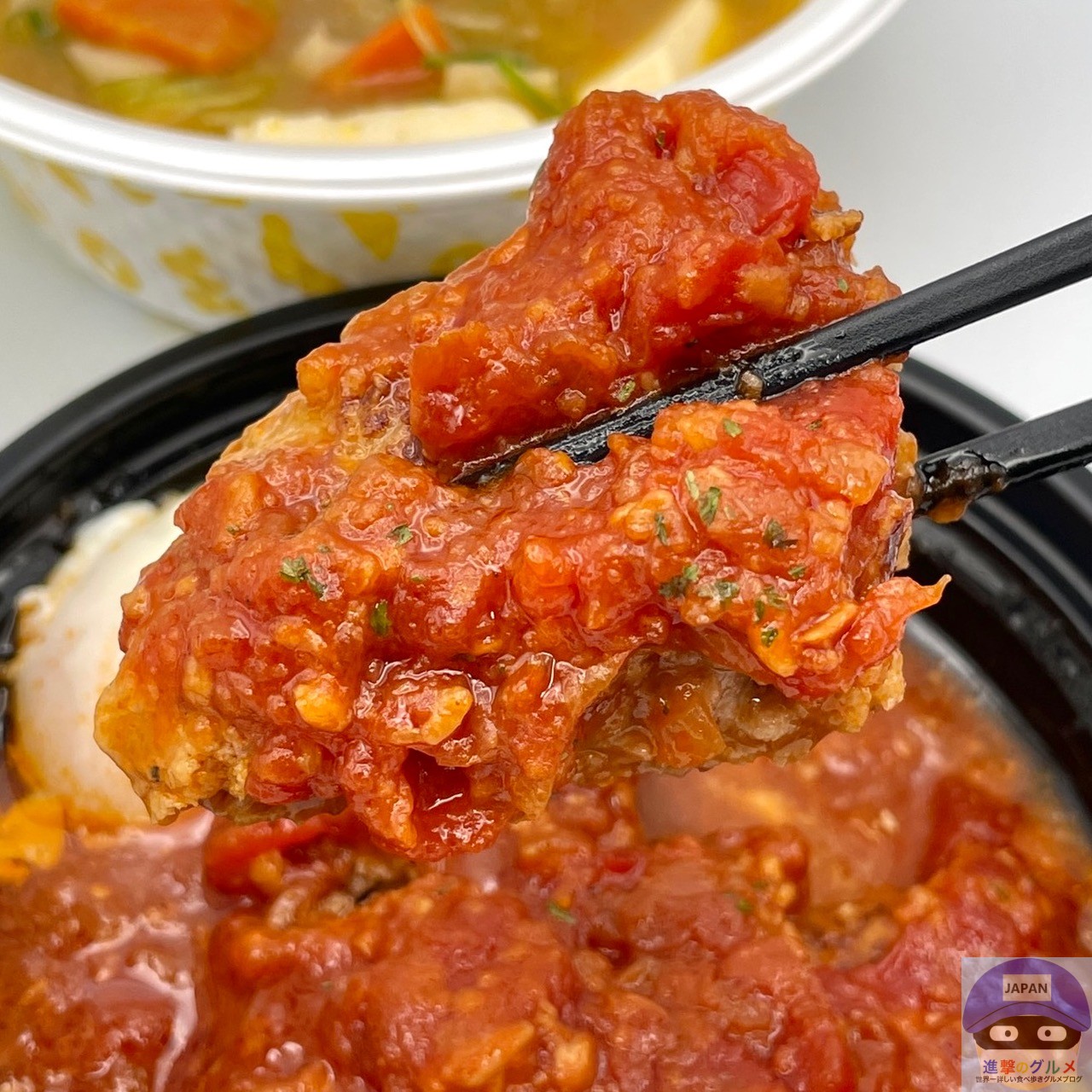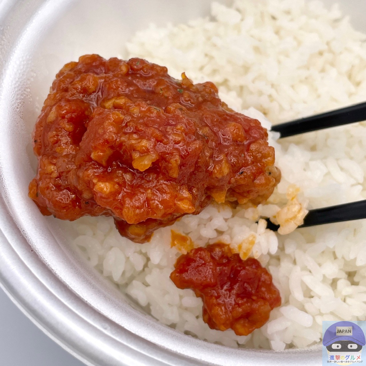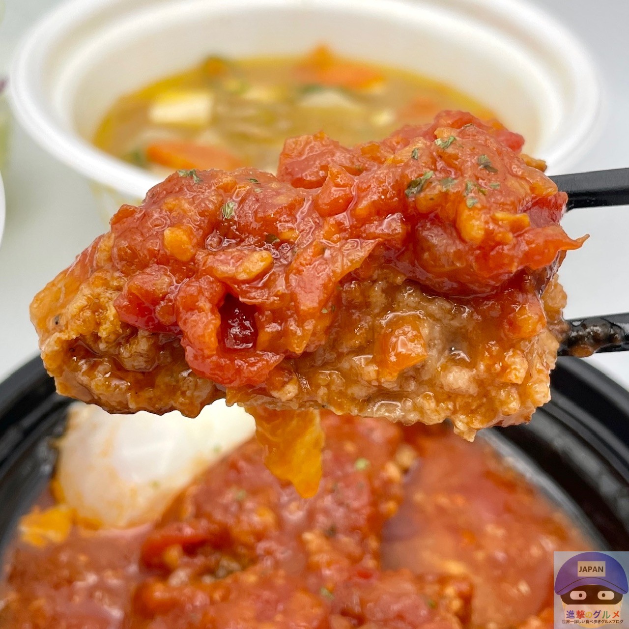筋のような粗挽きの粒がいくつか入った肉々しさがあり、じゅわっとした特製ソースのトマトの酸味とにんにくの旨みが食欲を刺激します。