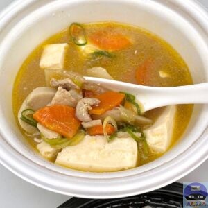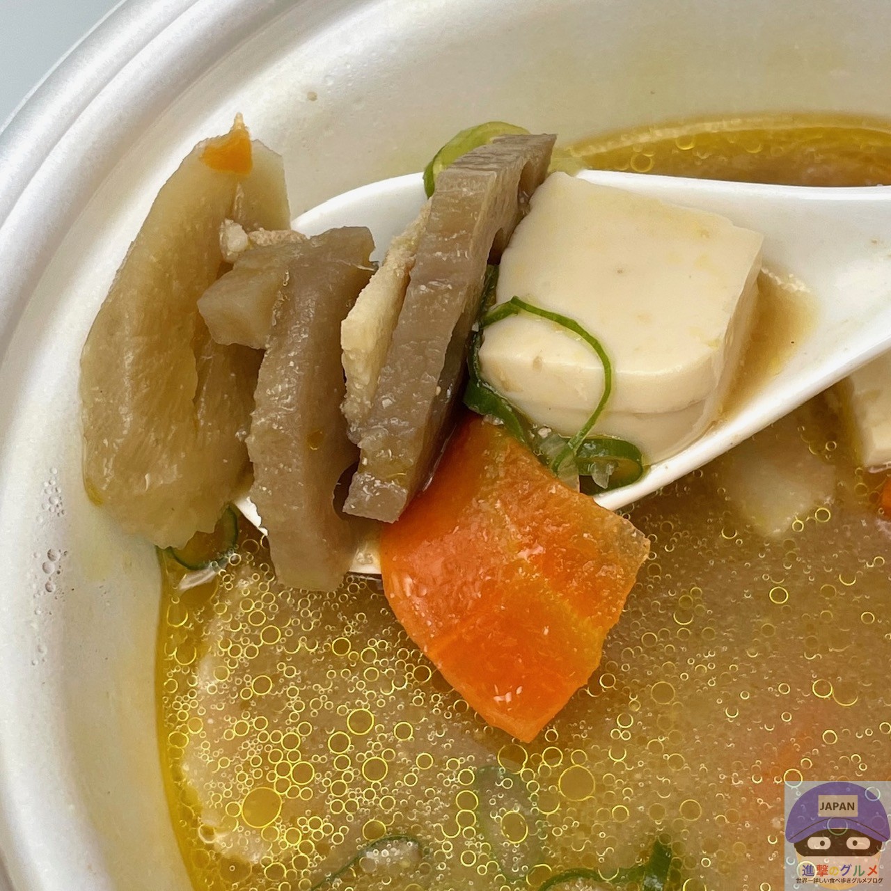 豚肉・大根・にんじん・ごぼう・里芋・レンコン・玉ねぎ・ねぎ・豆腐などが入っています。