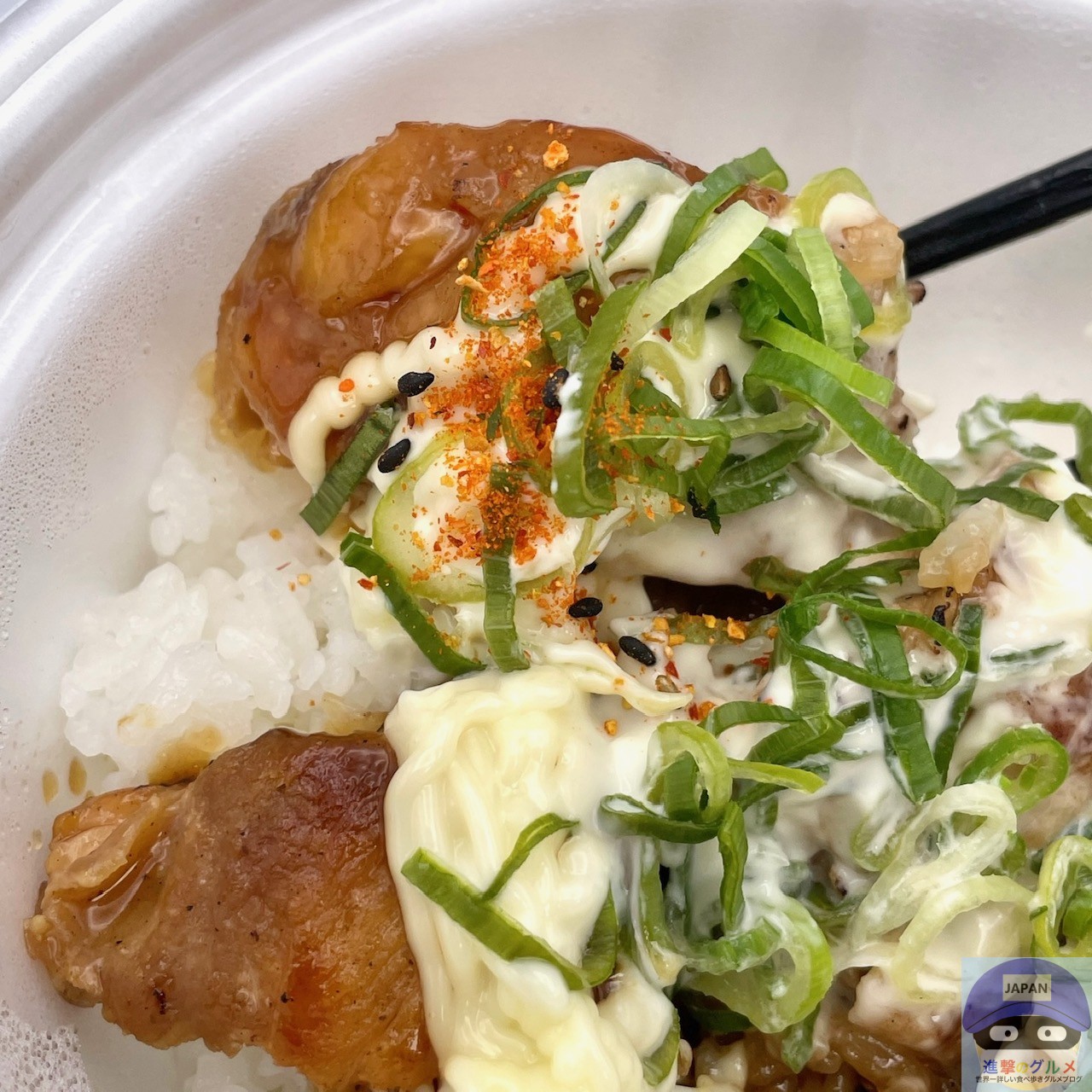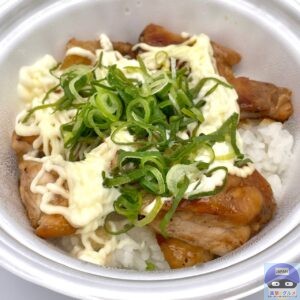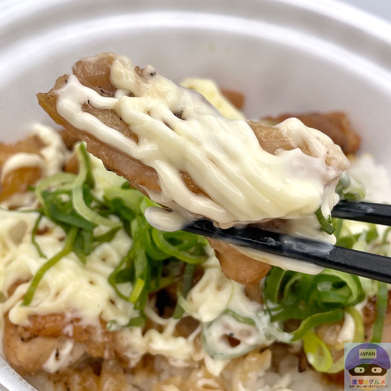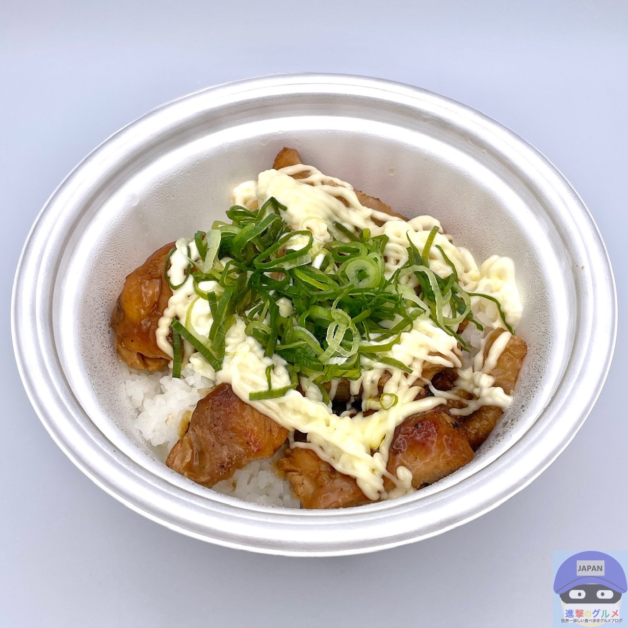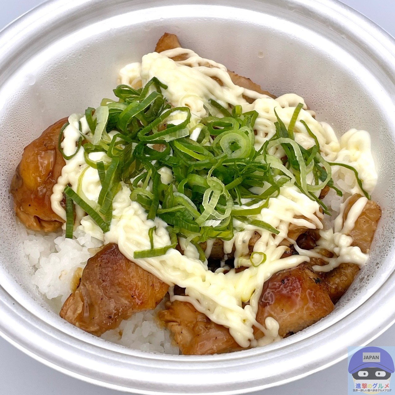 炙った鶏もも肉、醤油ダレ、マヨネーズ、ねぎ、ライスで作られたシンプルな見た目です。