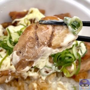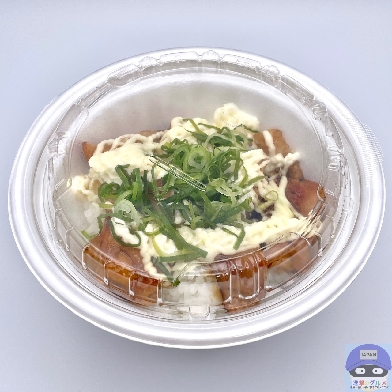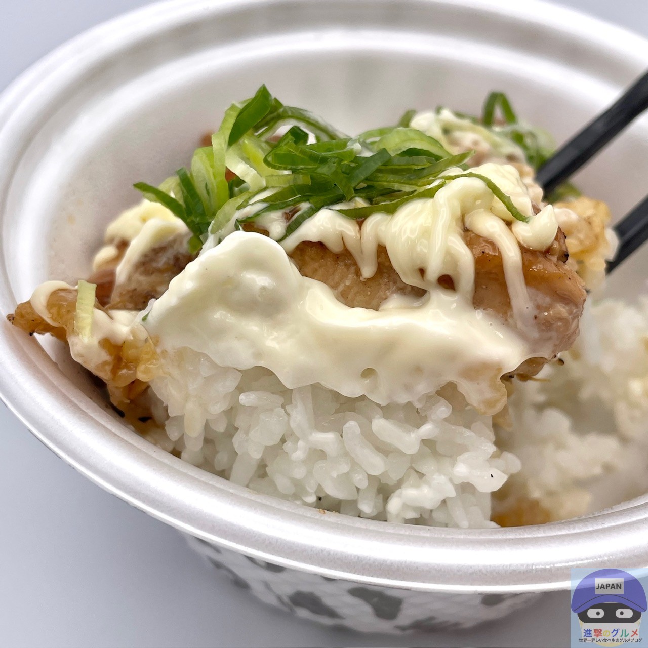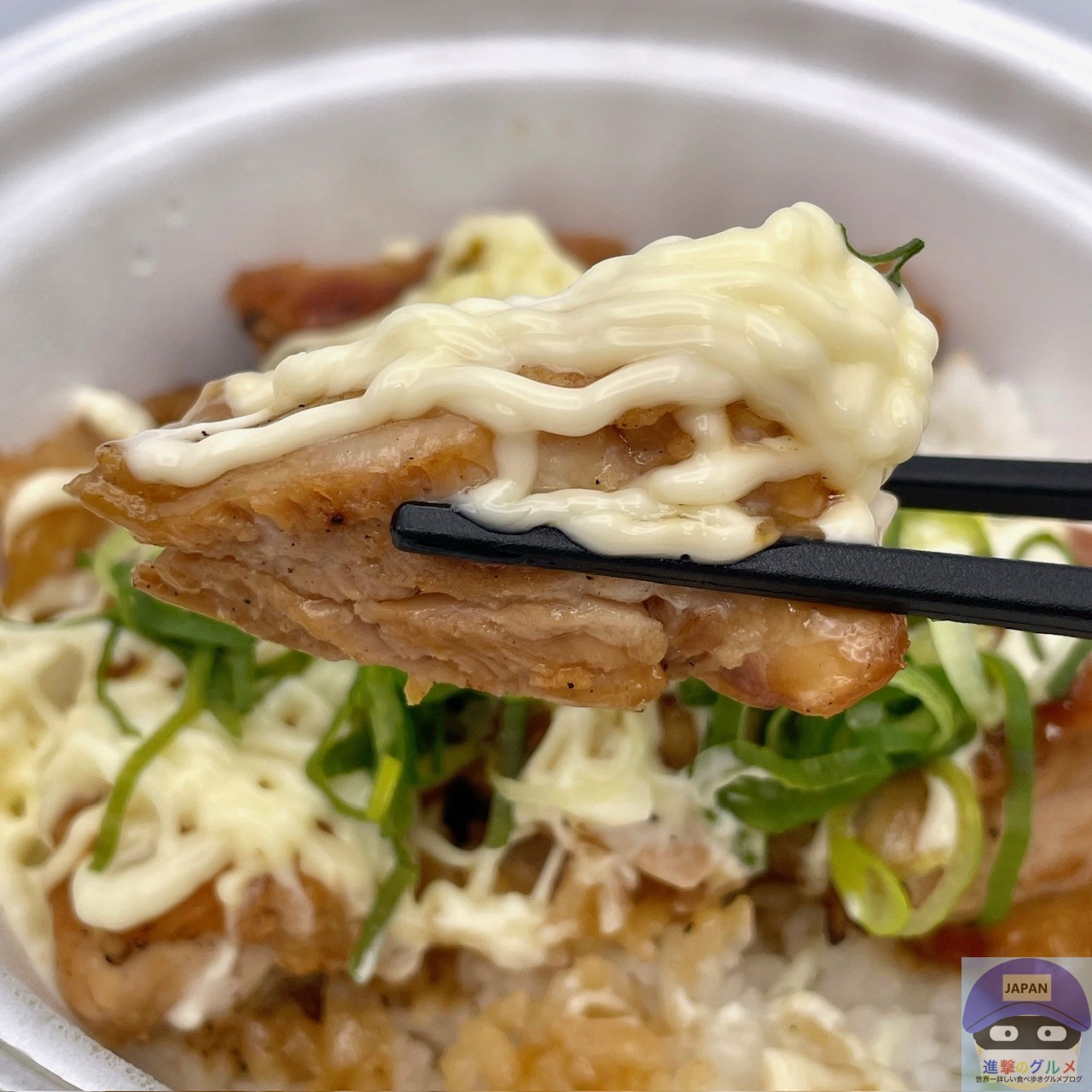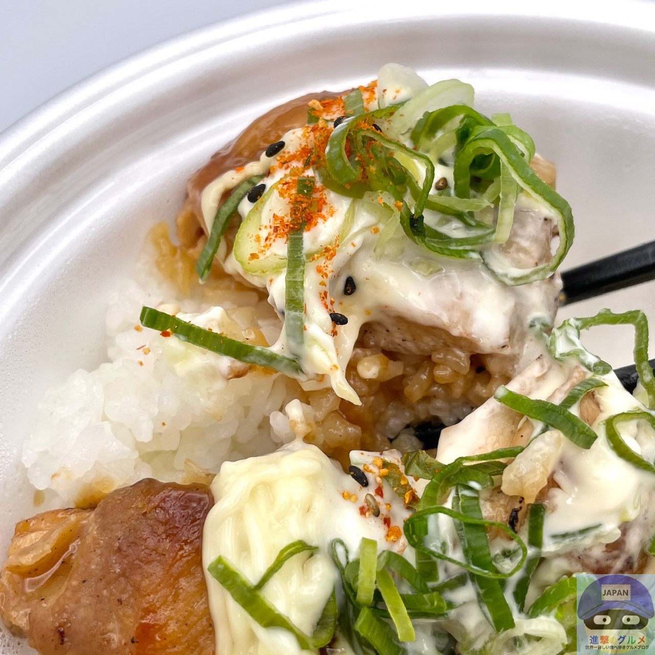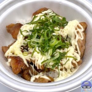 炙った鶏もも肉、醤油ダレ、マヨネーズ、ねぎ、ライスで作られたシンプルな見た目です。