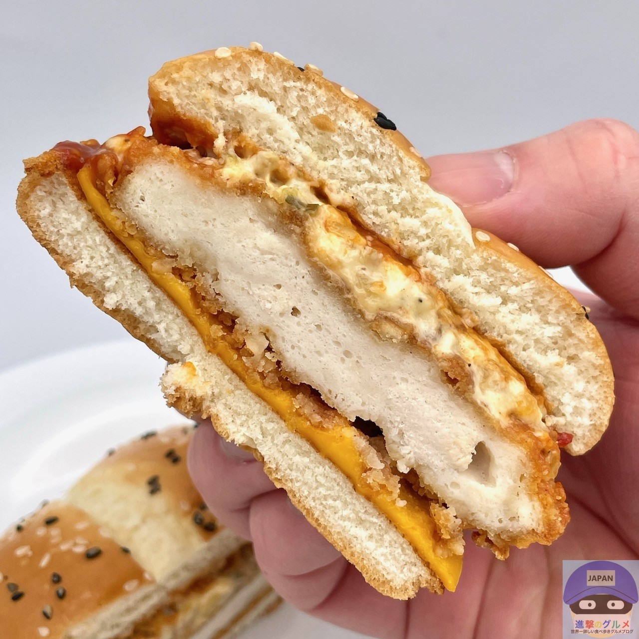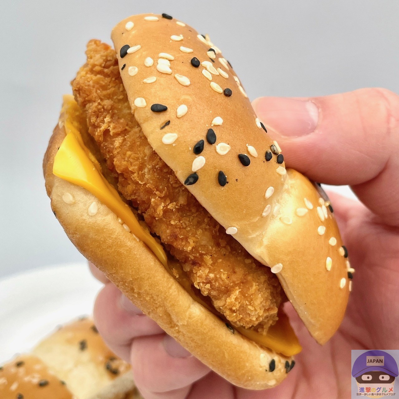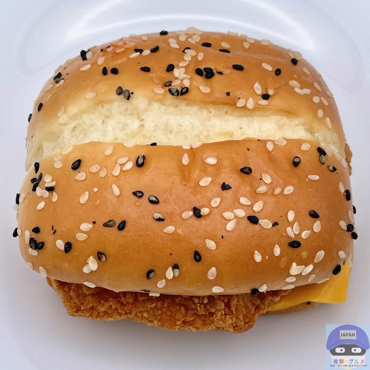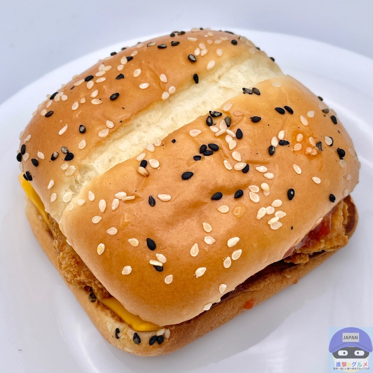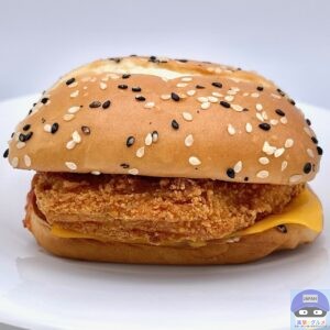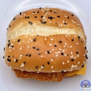 チキンパティ・チェダースライスチーズ・ホットチリガーリックソース・サワークリームタルタルソースを、ごま付きの特製バンズで挟んでいます。