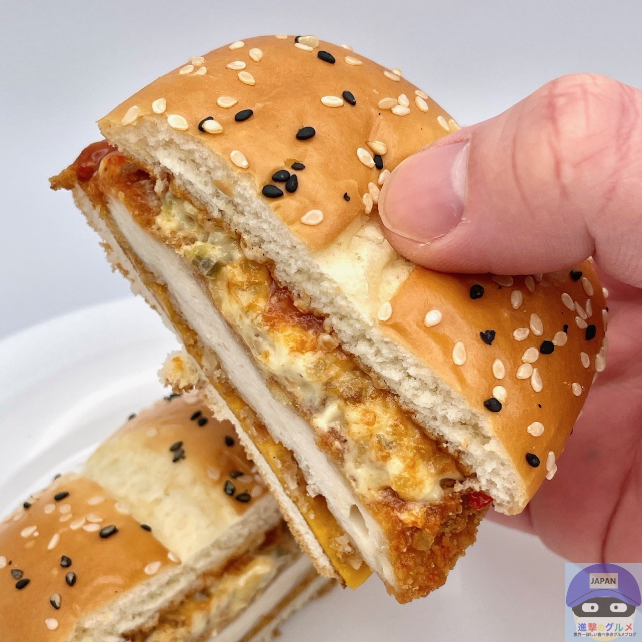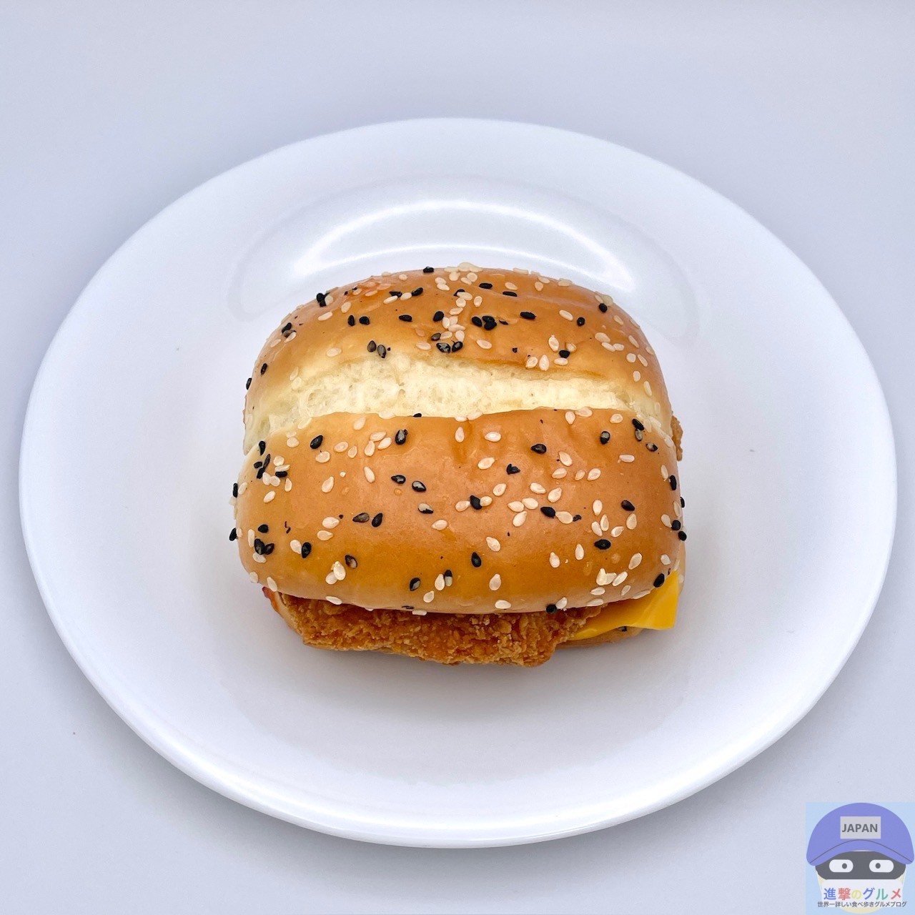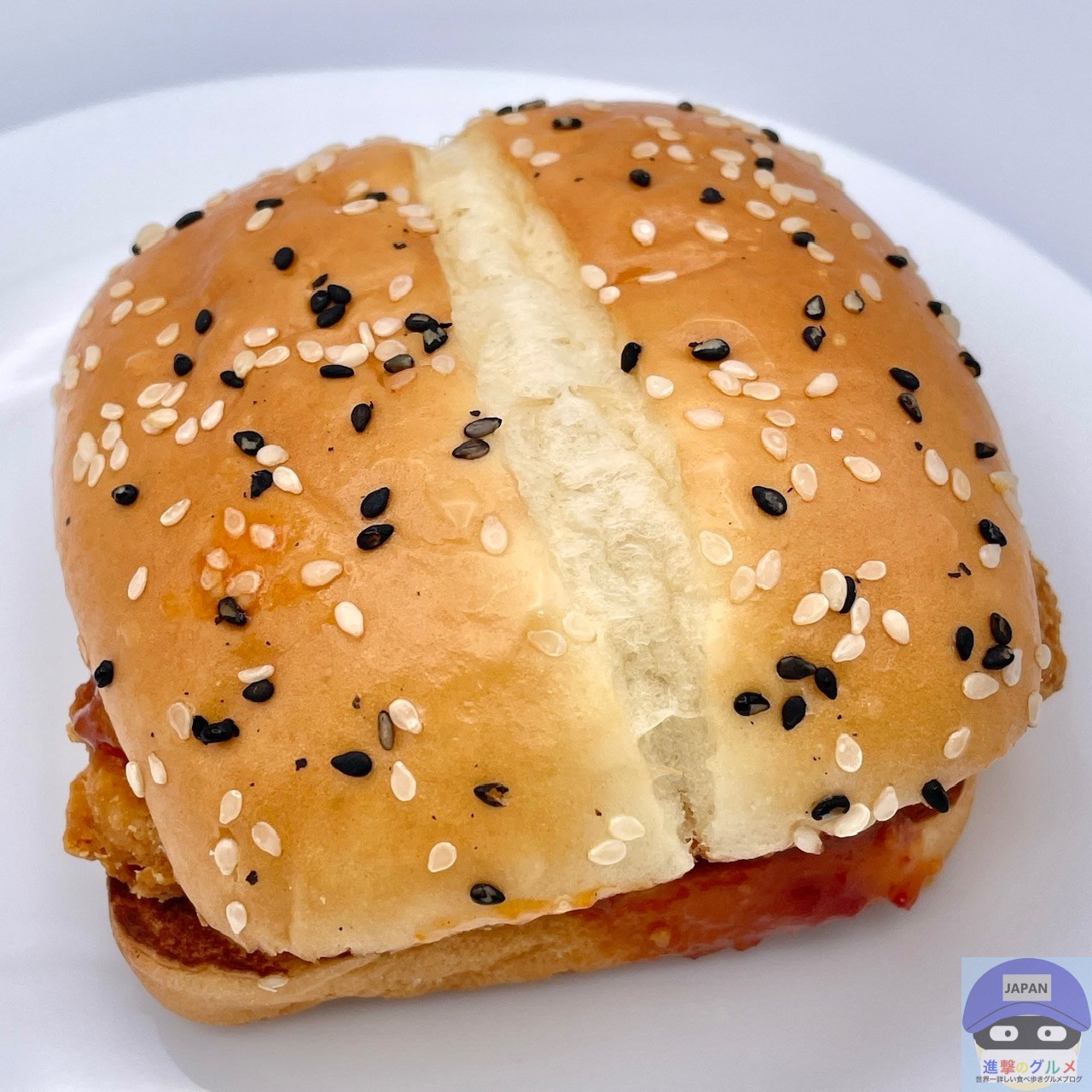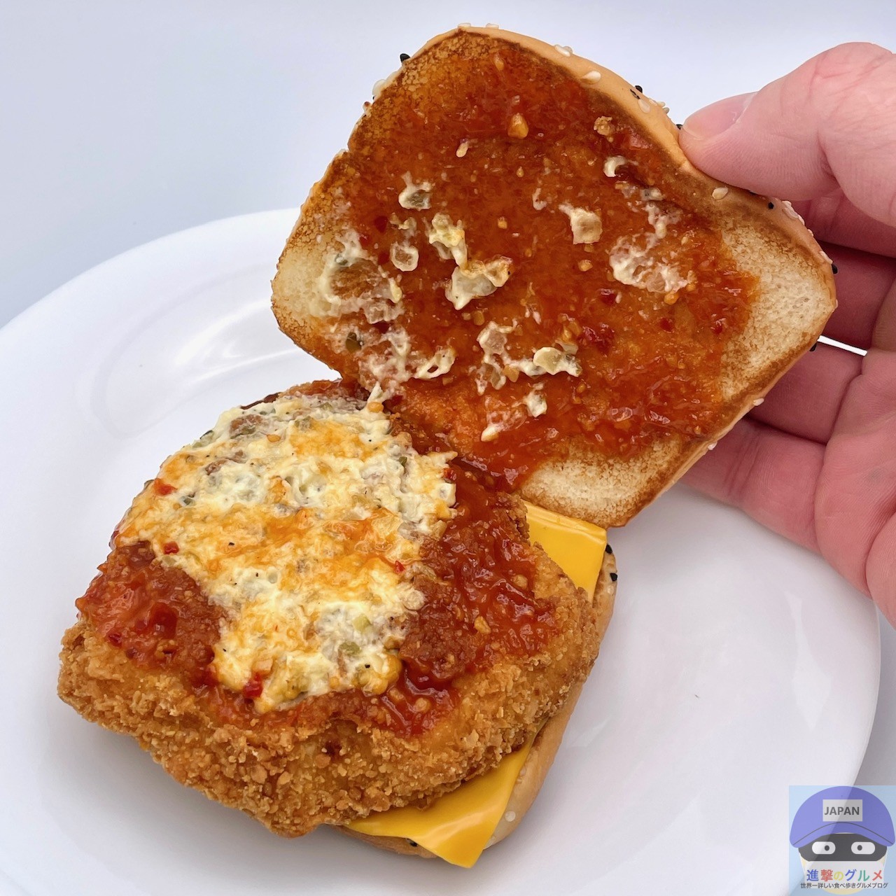チキンパティ・チェダースライスチーズ・ホットチリガーリックソース・サワークリームタルタルソースを、ごま付きの特製バンズで挟んでいます。