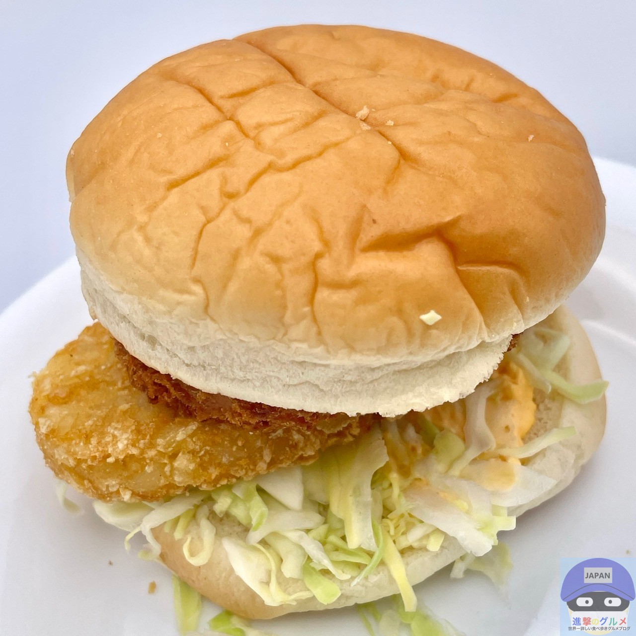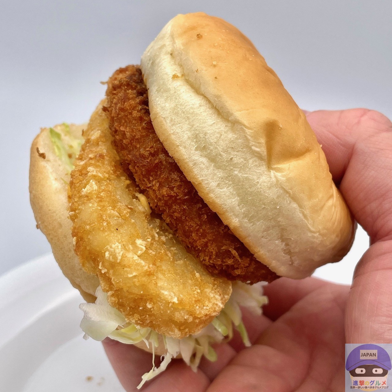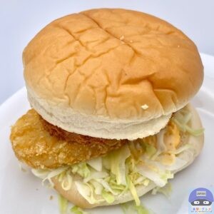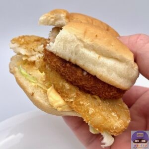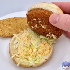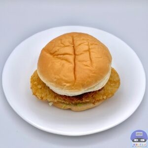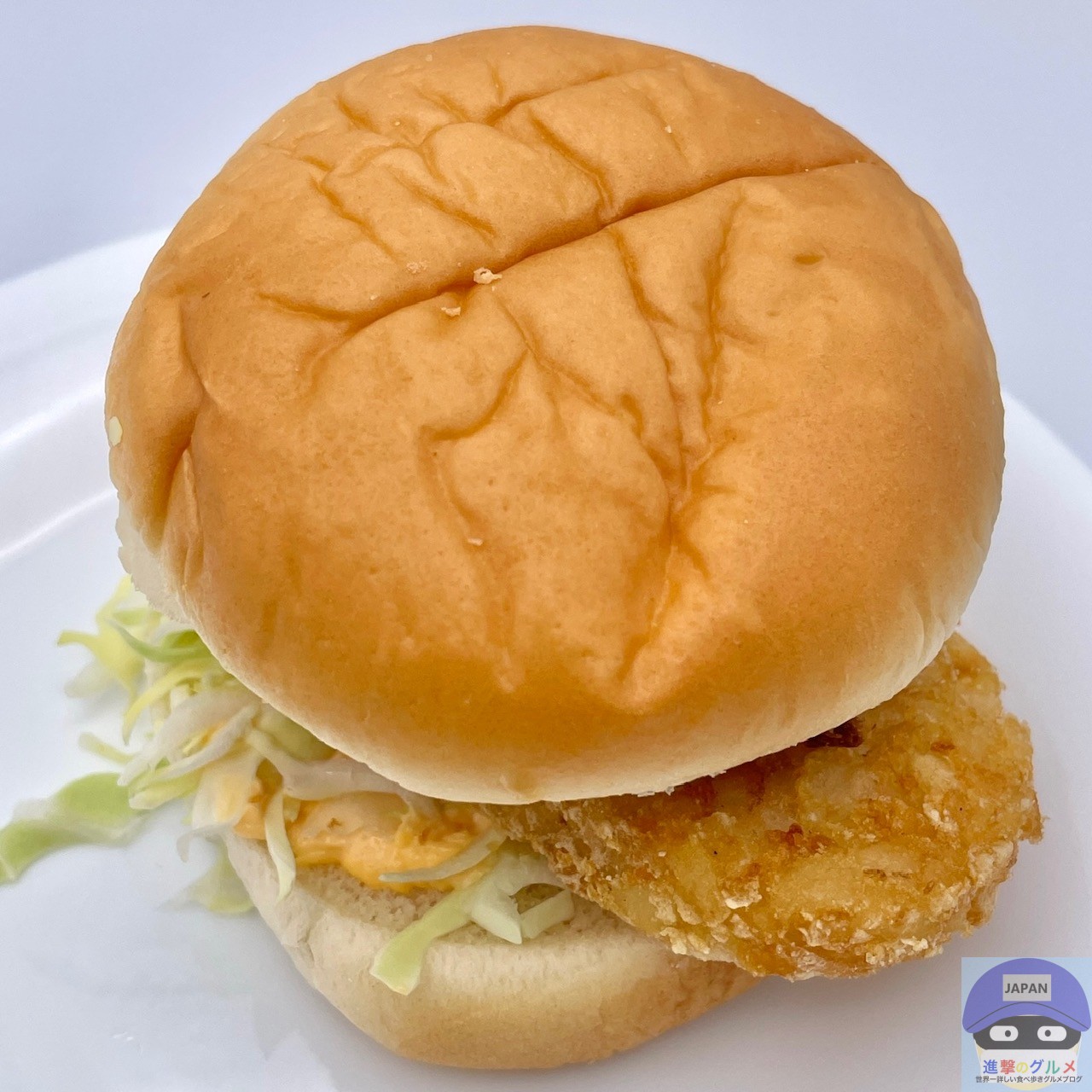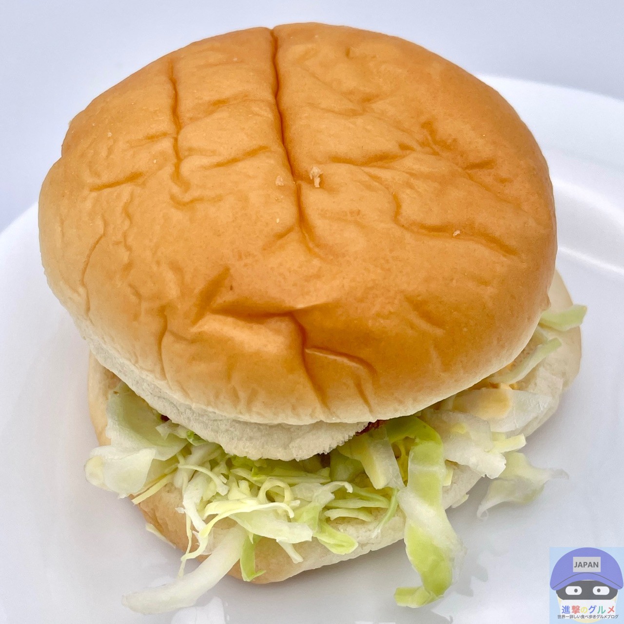ふんわり食感のやわらかい蒸しバンズで、グラタンコロッケは、衣がサクッと香ばしく、少しもったりした口当たりのホワイトソースが入ってクリーミーです。