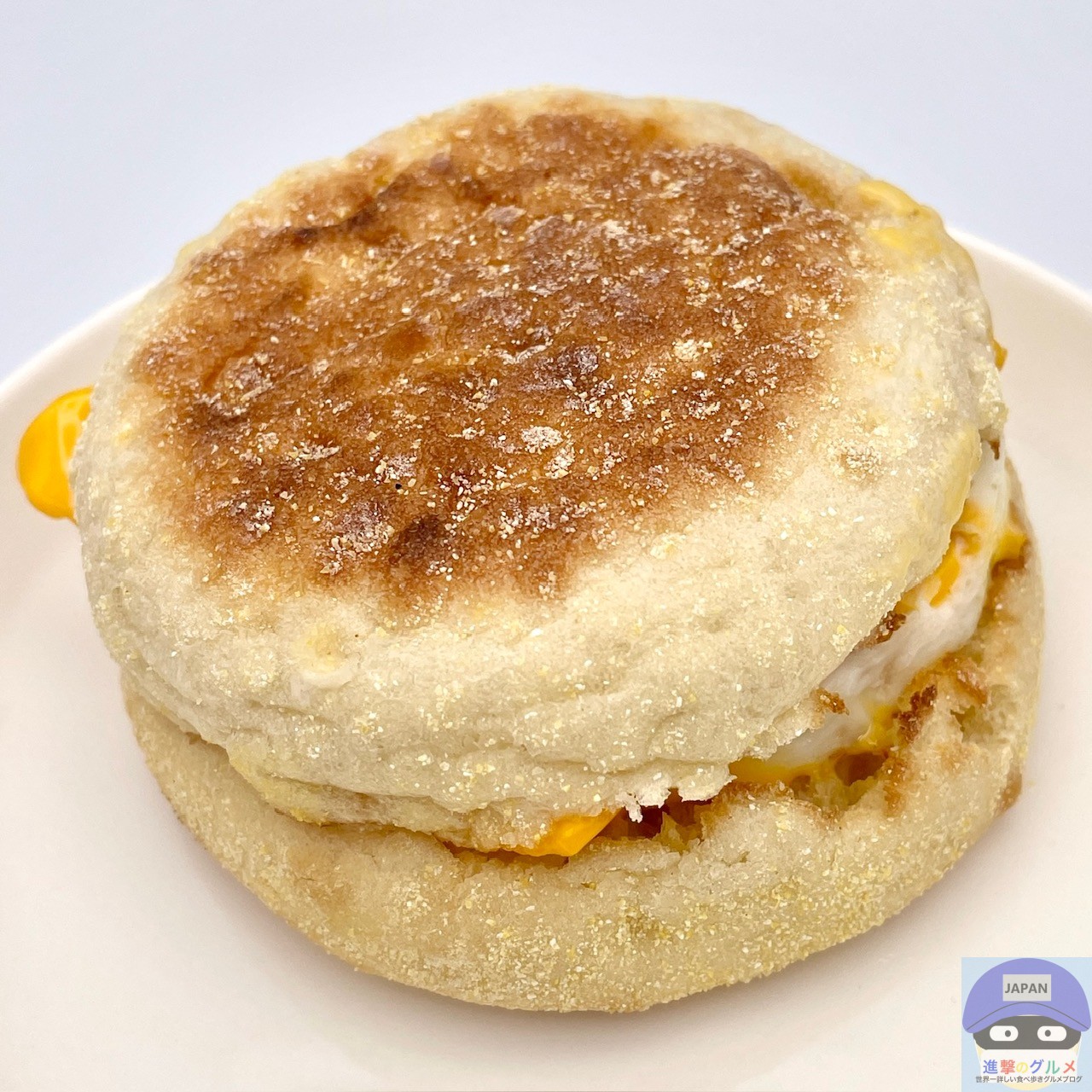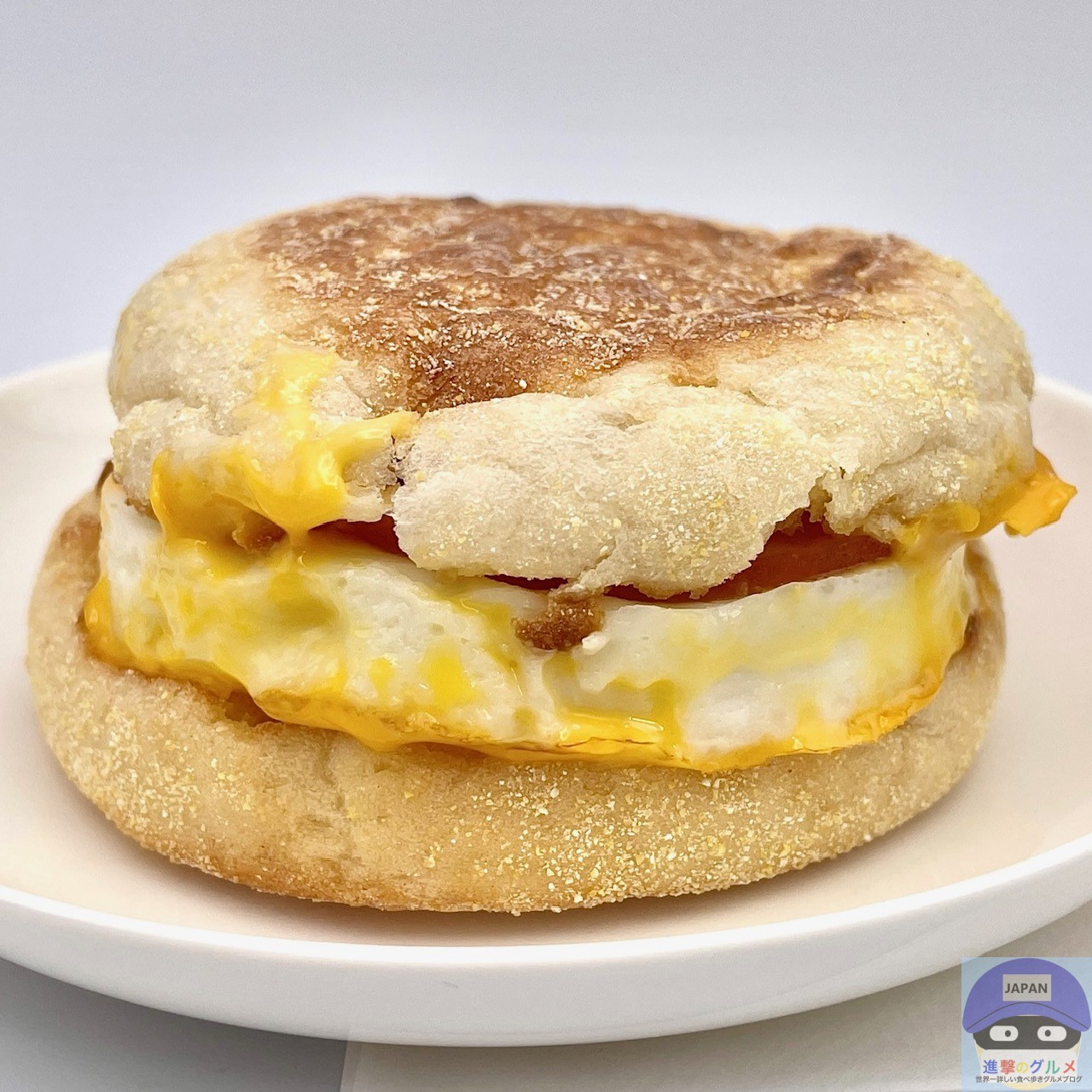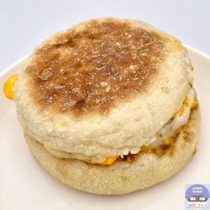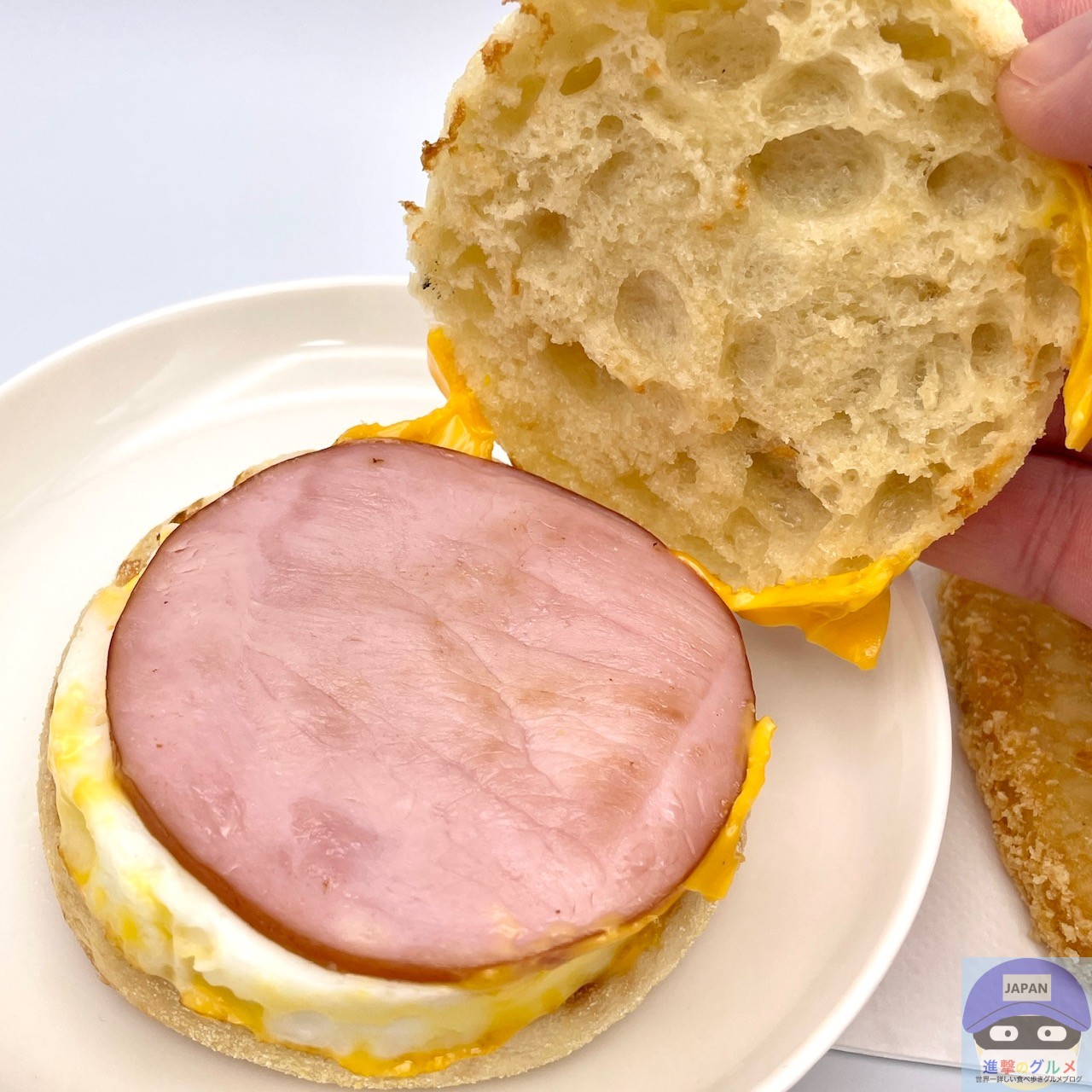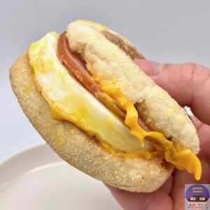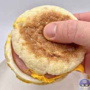 カナディアンベーコン(ロースハム)・たまご・チェダースライスチーズなどを、イングリッシュマフィンで挟んでいます。