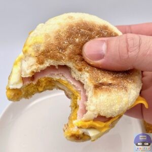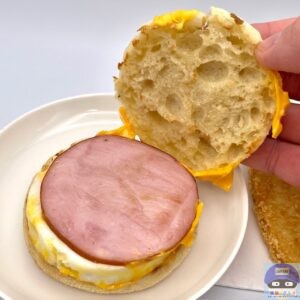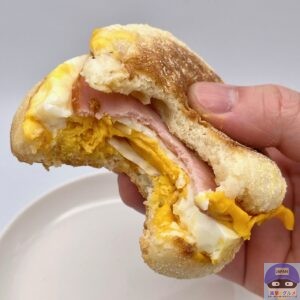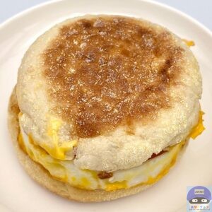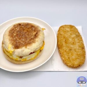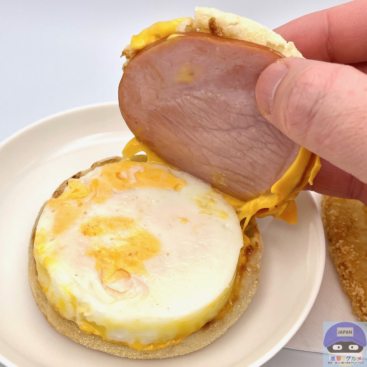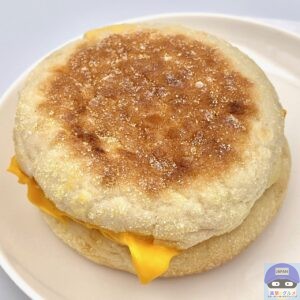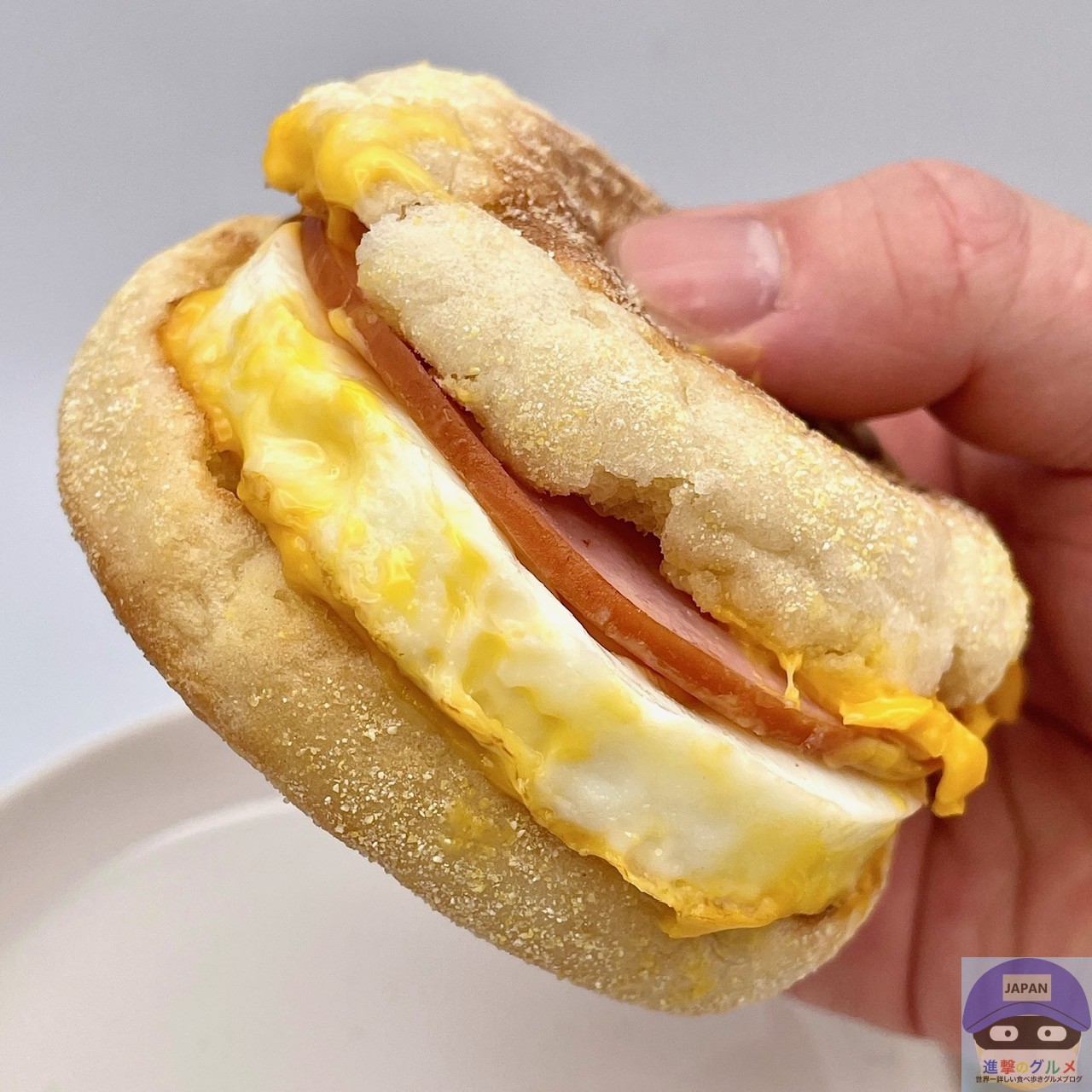カナディアンベーコン(ロースハム)・たまご・チェダースライスチーズなどを、イングリッシュマフィンで挟んでいます。