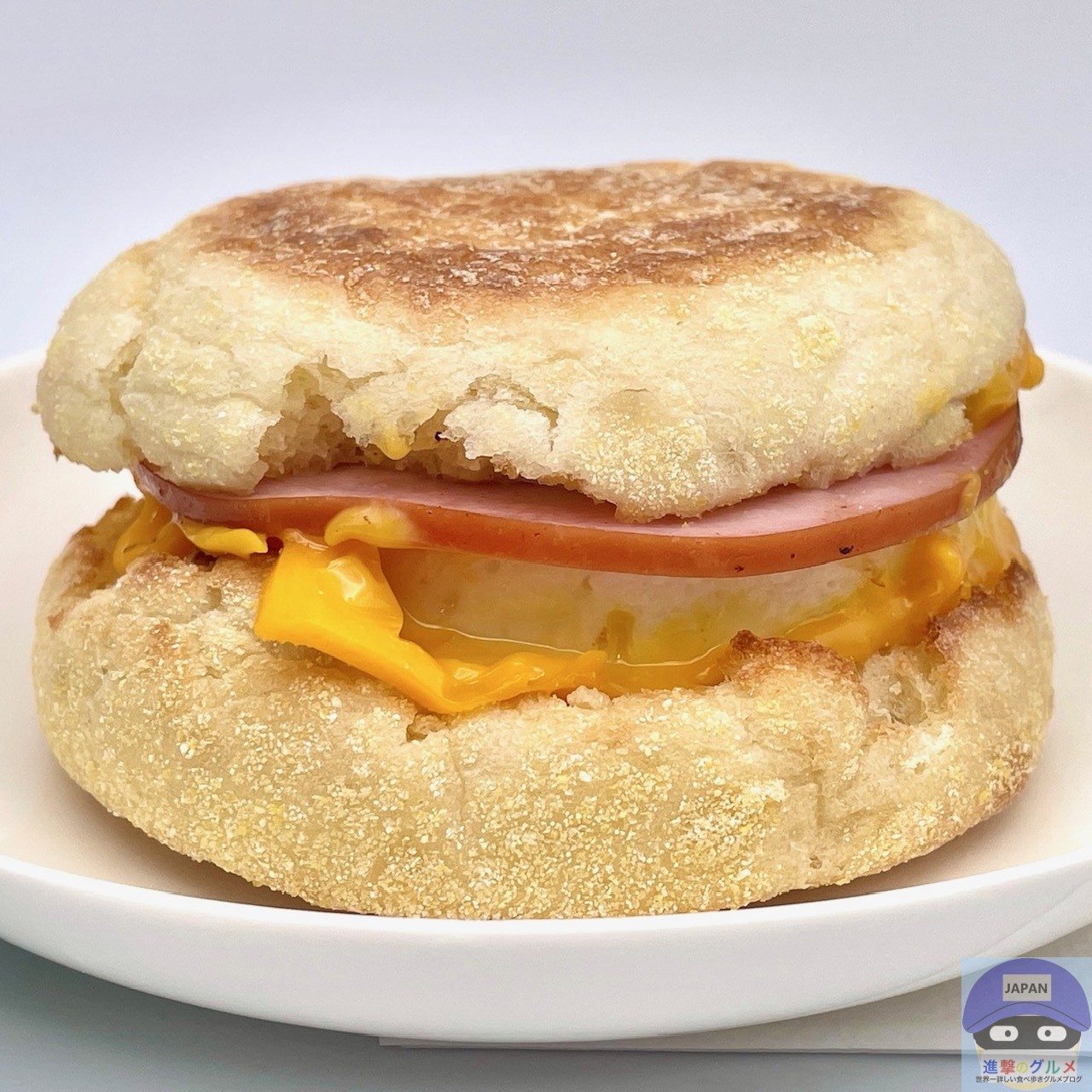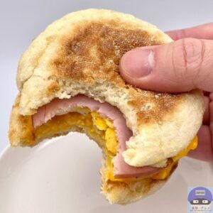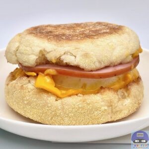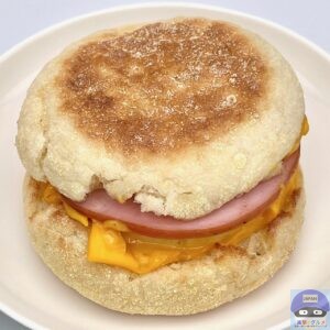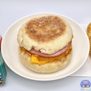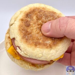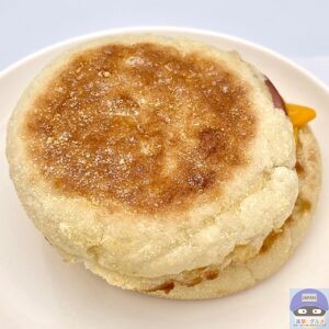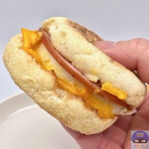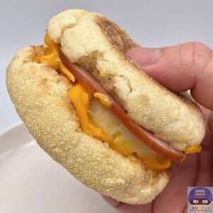 カナディアンベーコン(ロースハム)・たまご・チェダースライスチーズなどを、イングリッシュマフィンで挟んでいます。