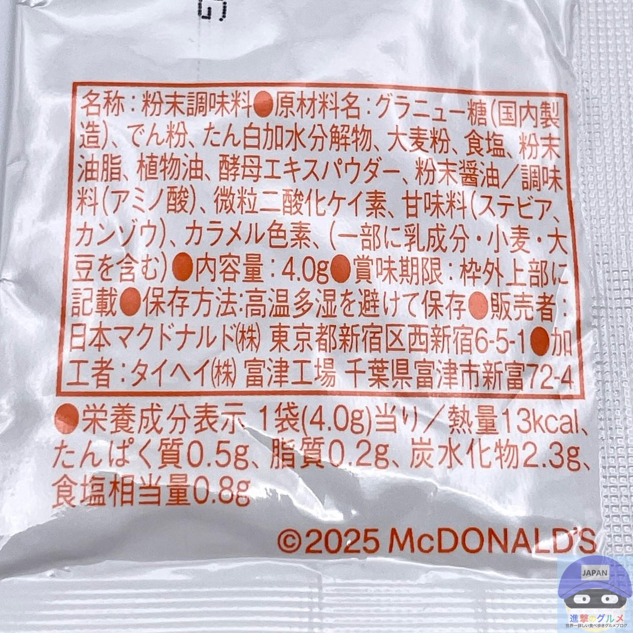 ハッピーターン味シーズニングは、原材料名にグラニュー糖、でん粉、大麦粉、食塩、粉末油脂、粉末醤油などが書かれています。