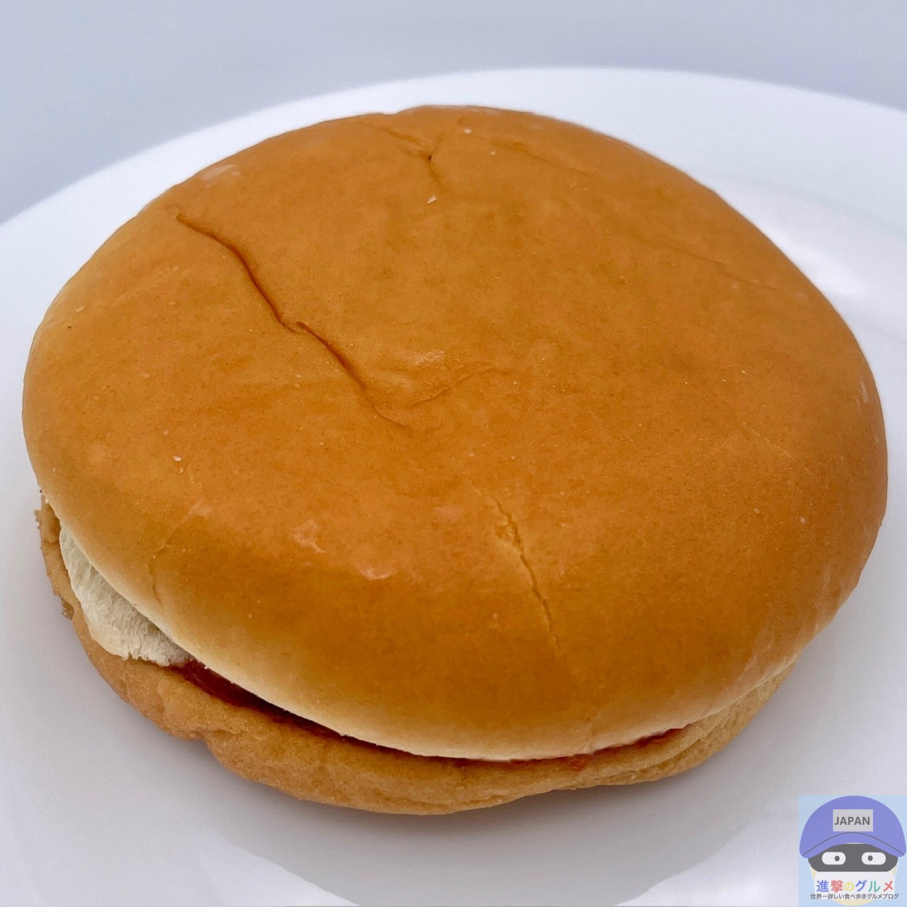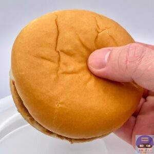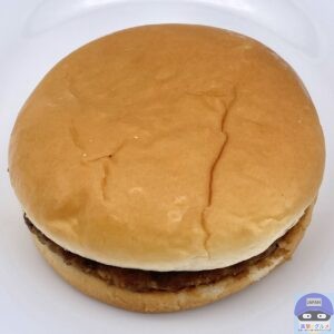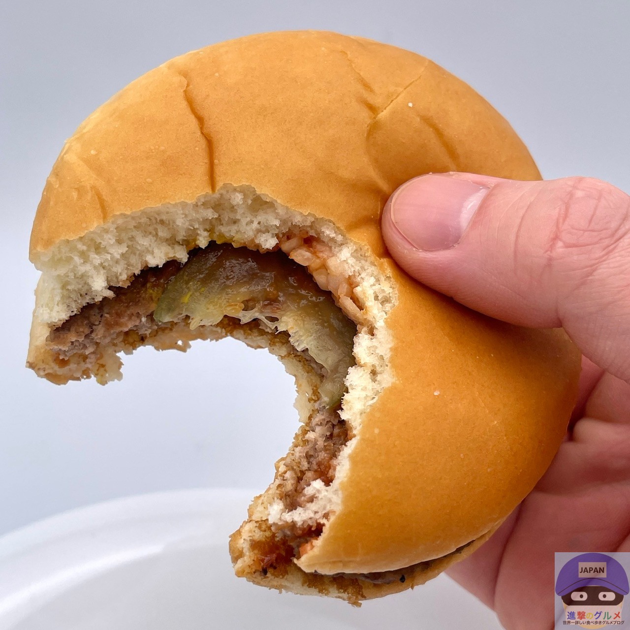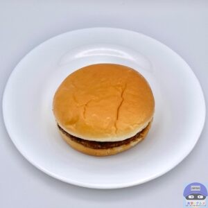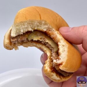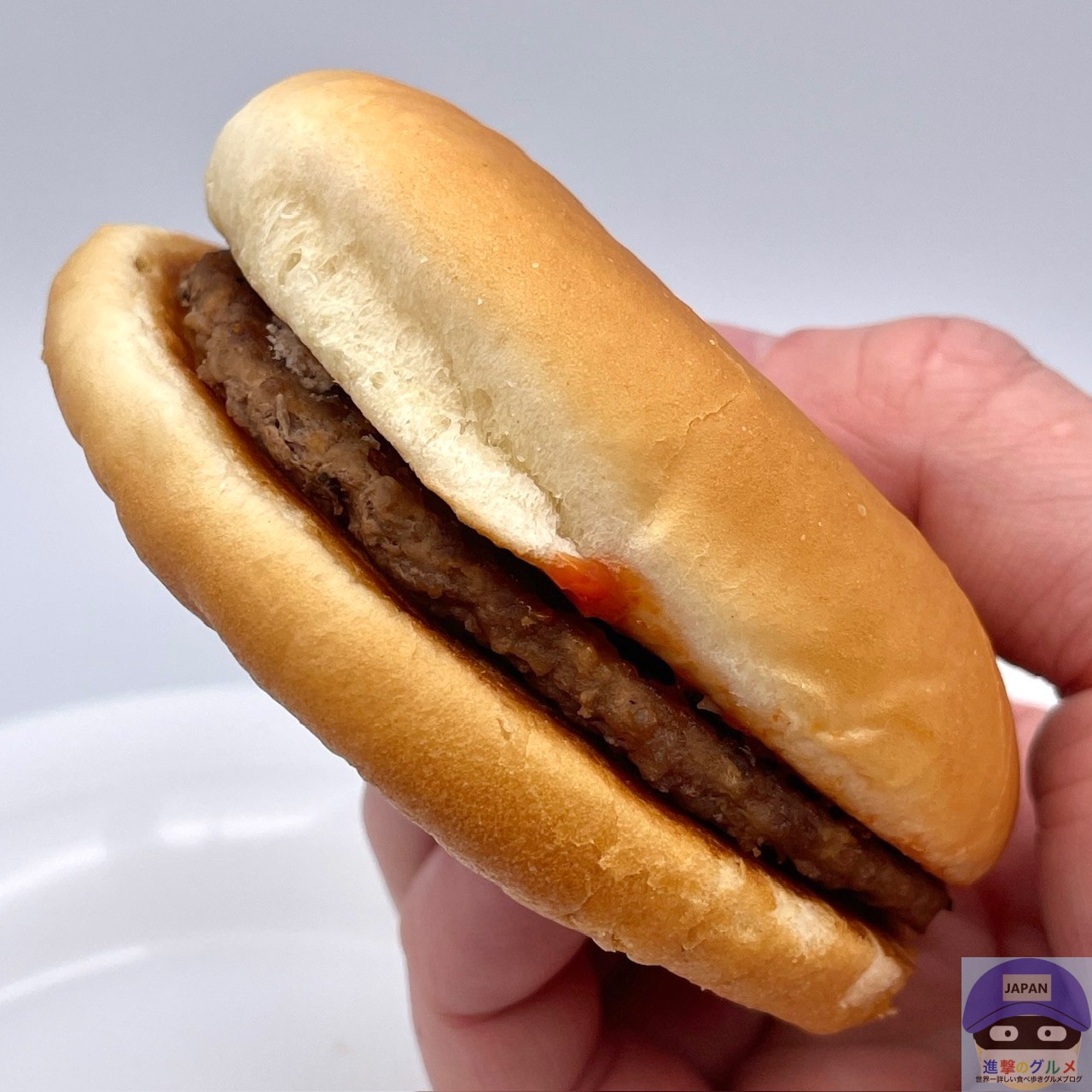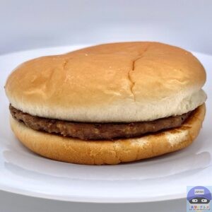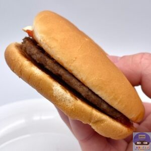 シンプルな見た目で、ビーフパティ・オニオン・ピクルス・ケチャップ・マスタードをバンズで挟んでいます。