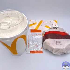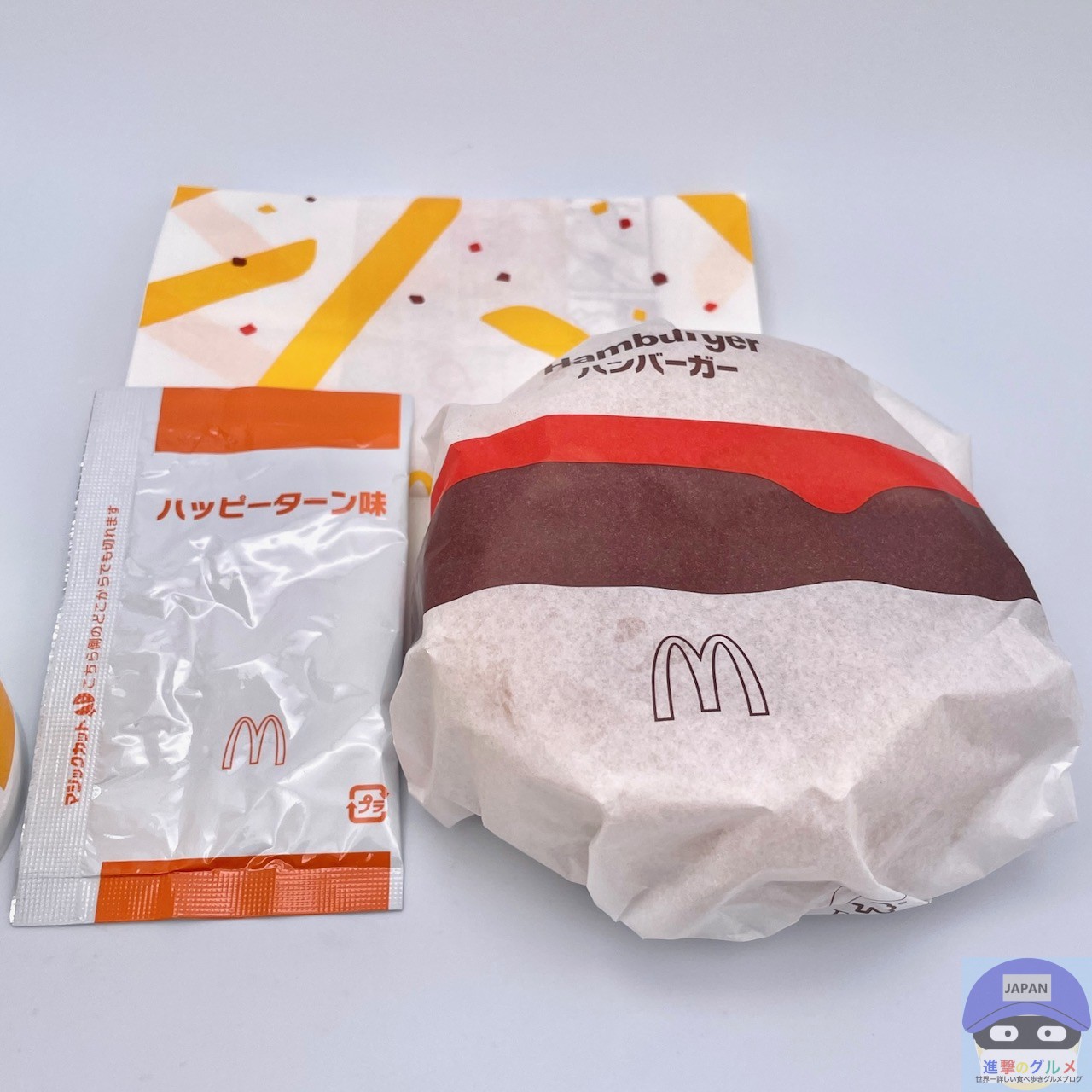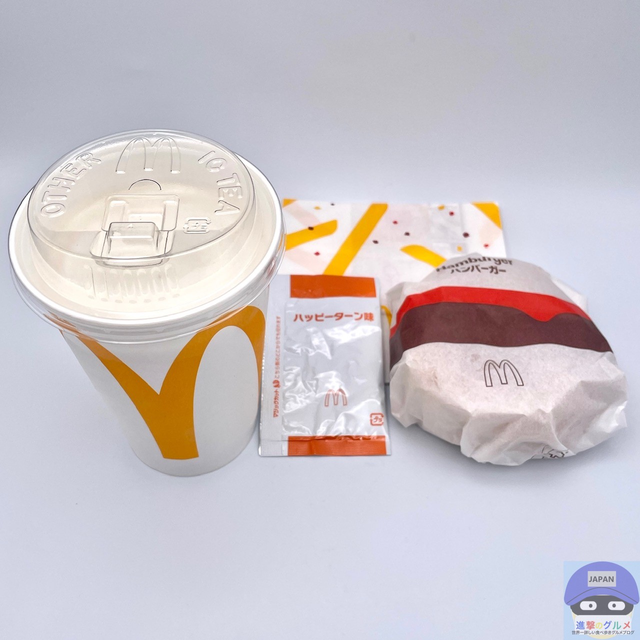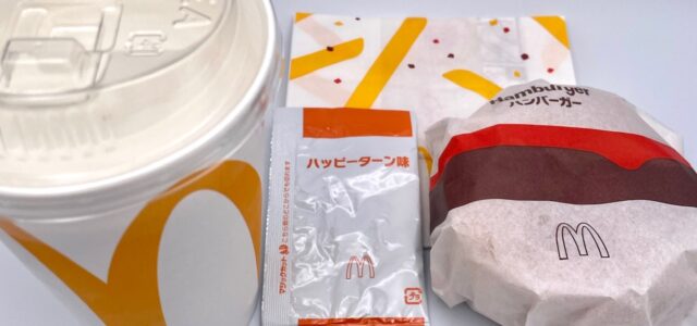 今回は、定番メニュー「ハンバーガー(190円)」と「マックシェイク バニラ・Mサイズ(230円)」、期間限定メニュー「ハッピーターン味シーズニング(40円)」を紹介します。
