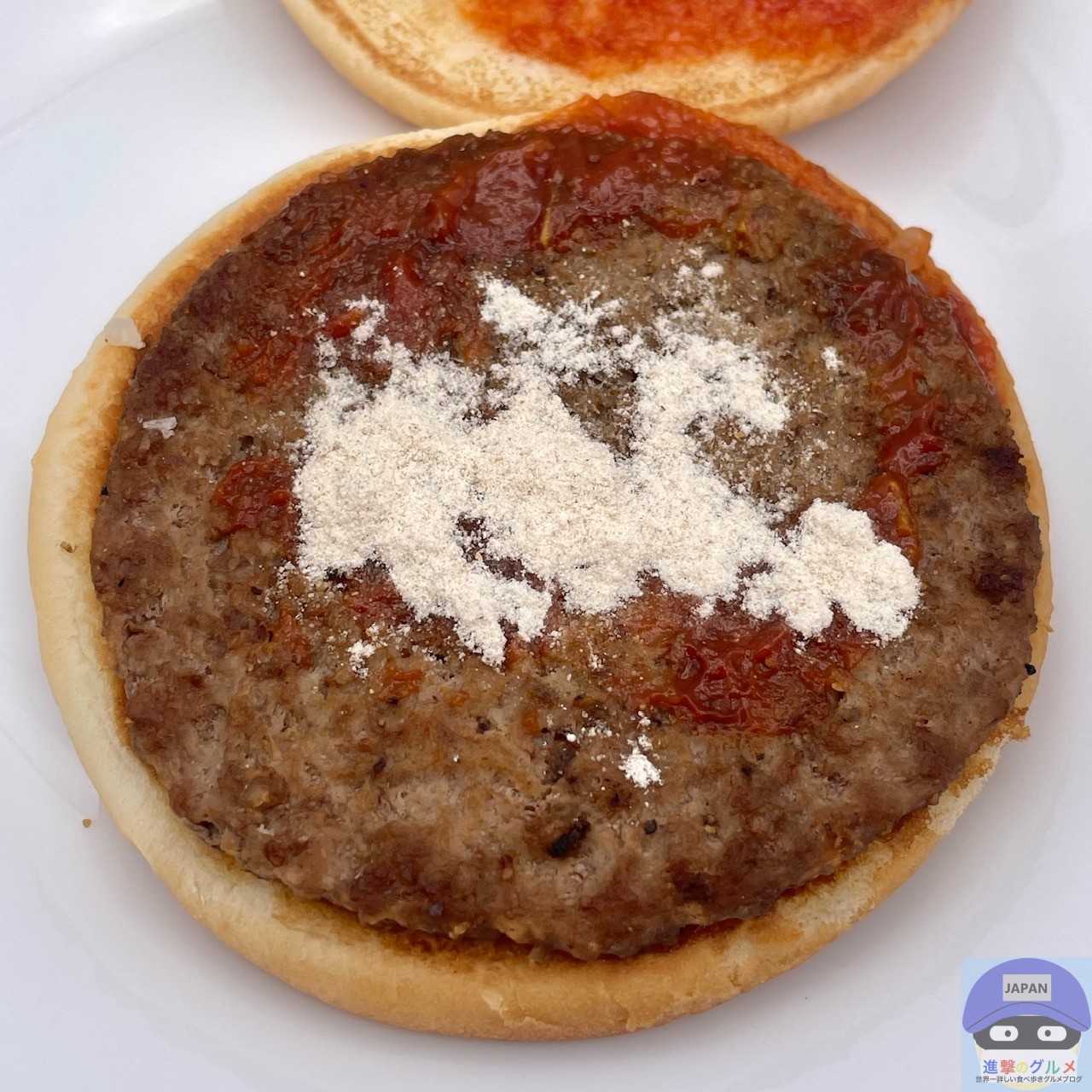 ハンバーガーにハッピーターン味シーズニングを適量トッピングします。