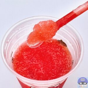 ひんやりシャリッと、一部粗めの氷がガリッと食感、いちごの風味と濃い味わいが広がります。