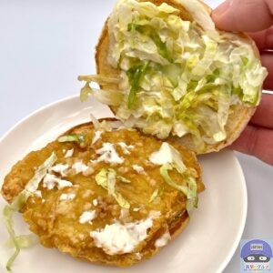 マックチキンパティは、サクッと衣でナゲットのような歯ごたえのあっさりした肉質、ピリッとペッパーの辛味がほんのり効いています。