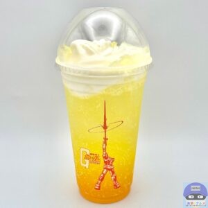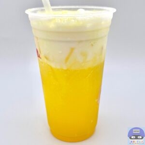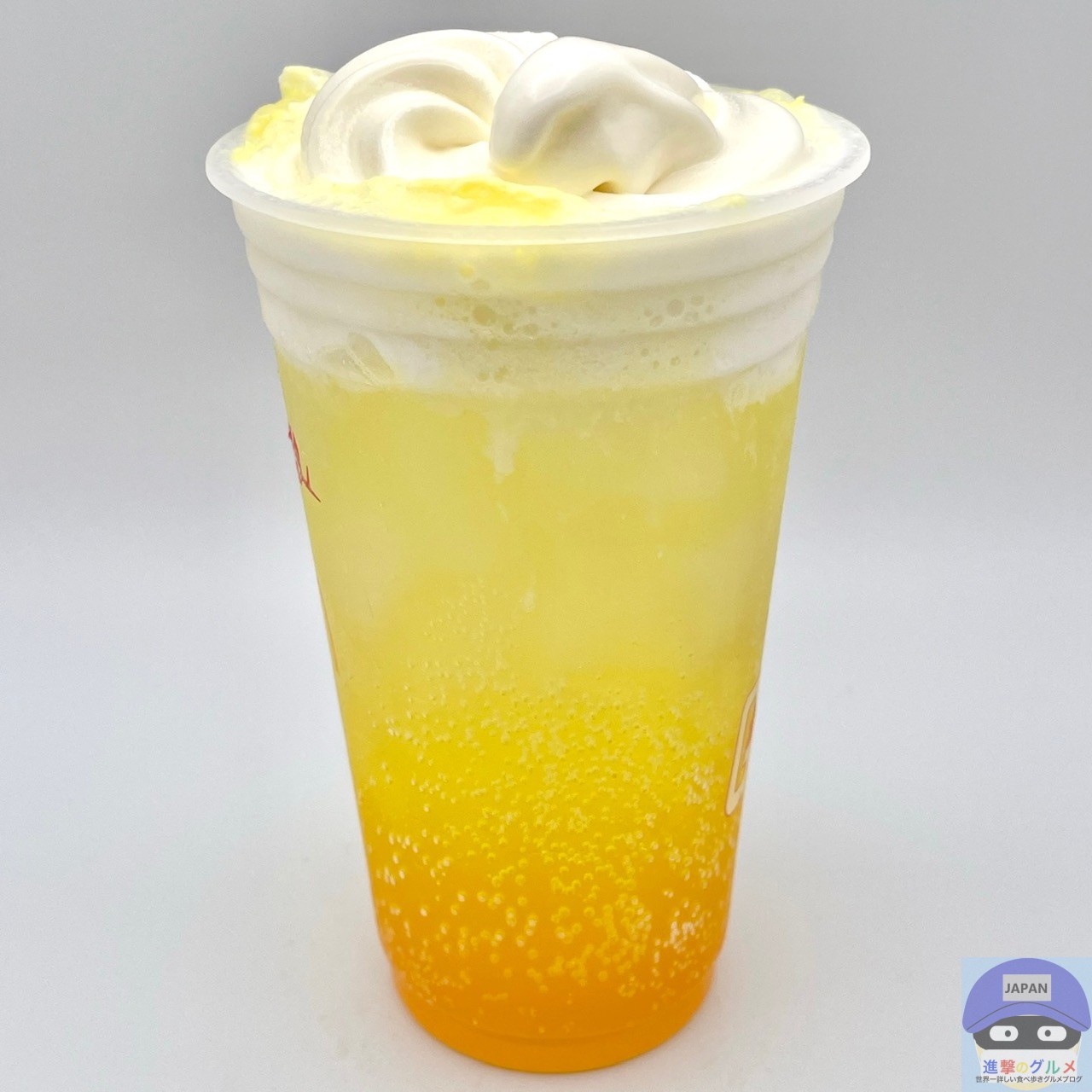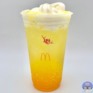 あざやかなオレンジっぽい黄色のマックフィズ(炭酸ドリンク)にソフトクリームをトッピングした、色合いの良い魅力的な見た目です。