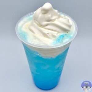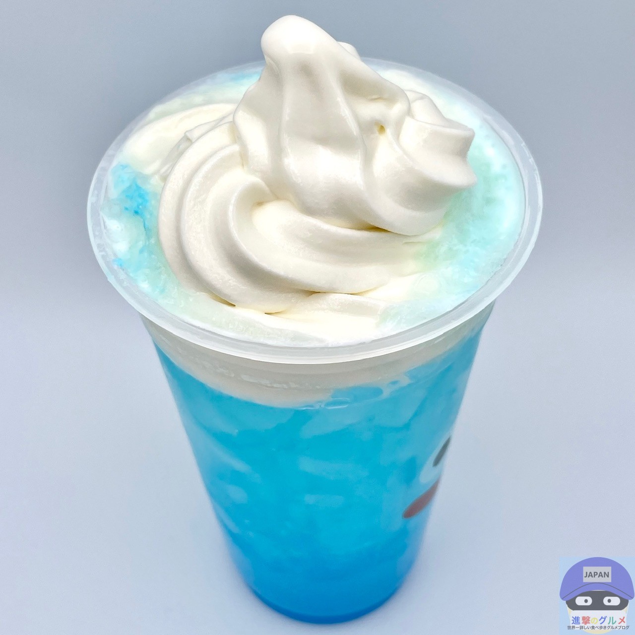 あざやかな青色のマックフィズ(炭酸ドリンク)にソフトクリームをトッピングした、色合いの良い魅力的な見た目です。
