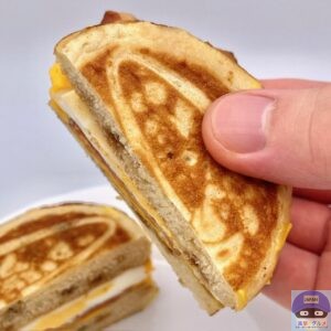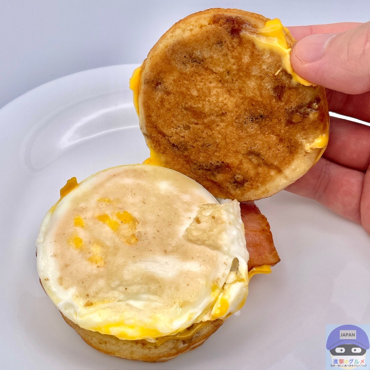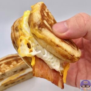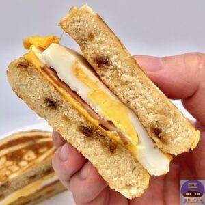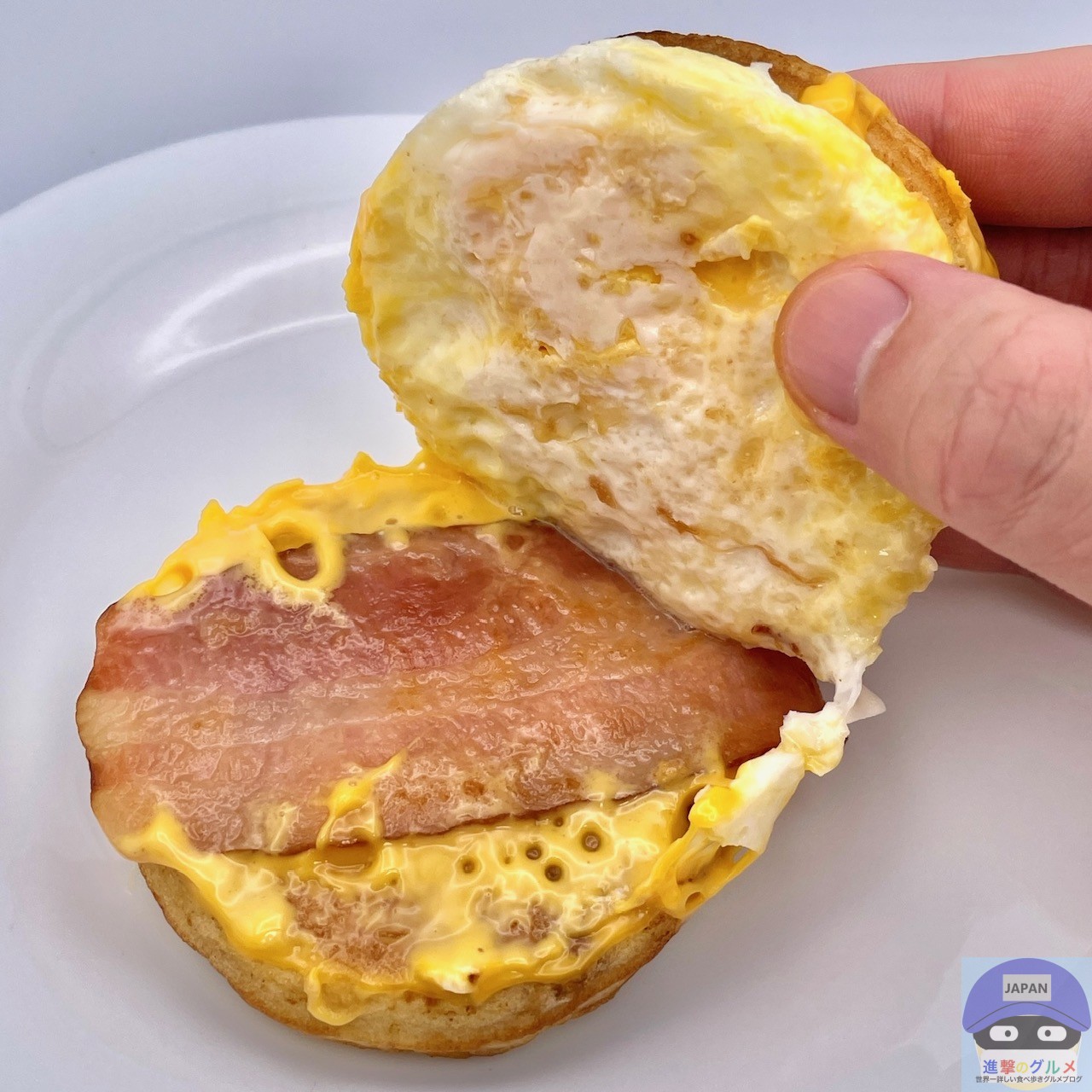 たまご・スモークベーコン・チェダースライスチーズを、メイプル風シロップ入りのグリドルケーキで挟んでいます。